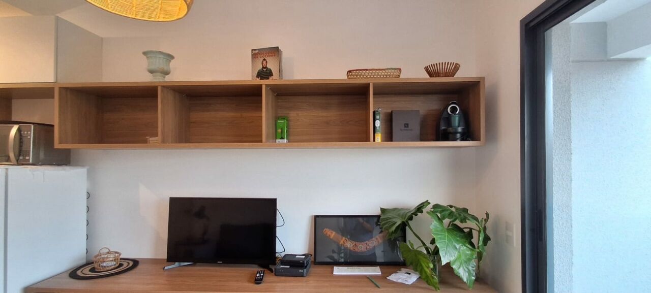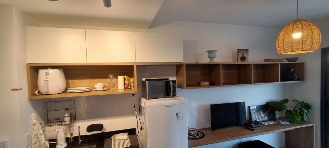 Diferencial, acabamento em marcenaria com balcão, nichos aéreos, espaço para refeição / home office e estudo. Luminária charmosa estilo rústico e sofá cama de 2 lugares. Mesa lateral e muitos acessórios.