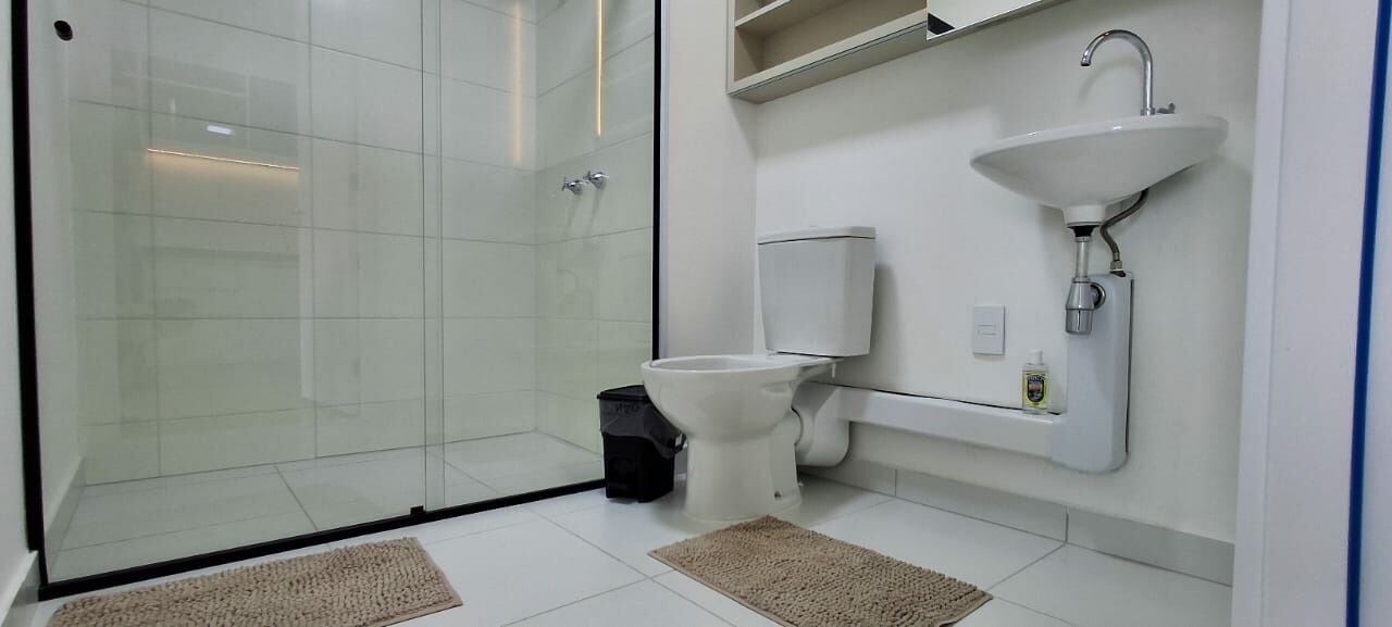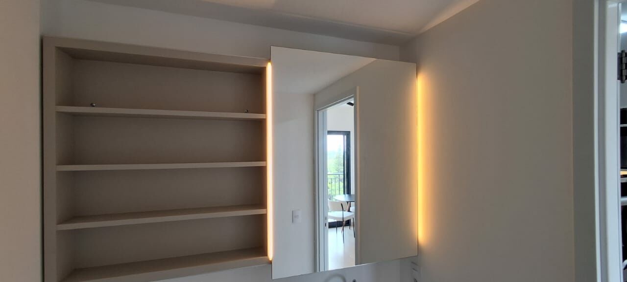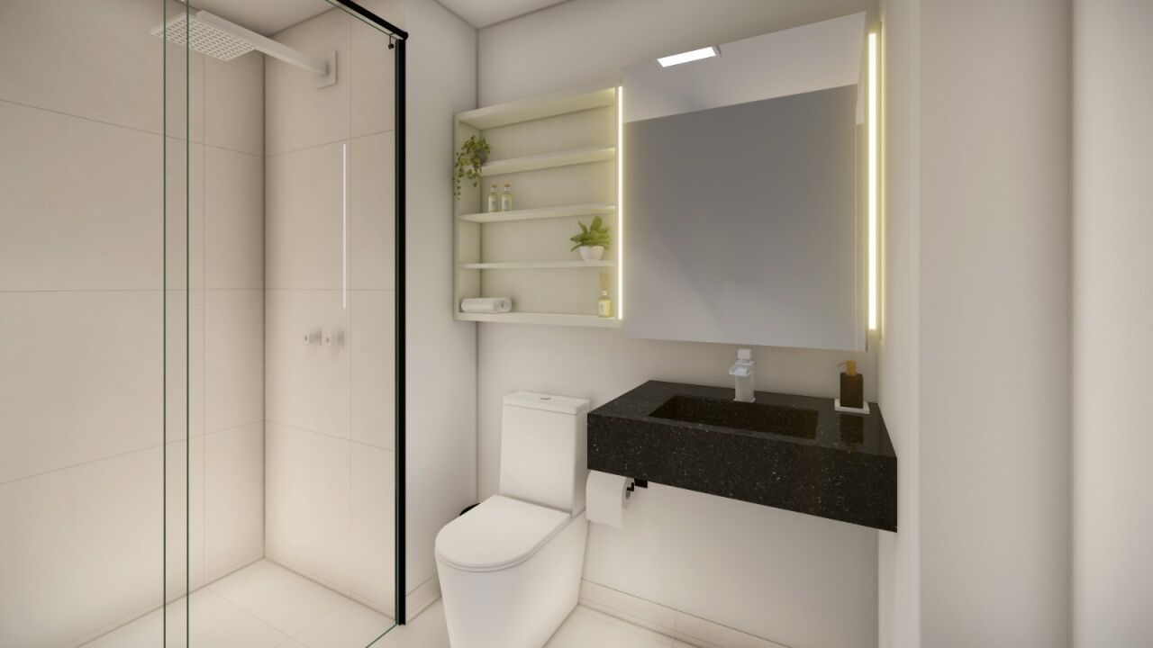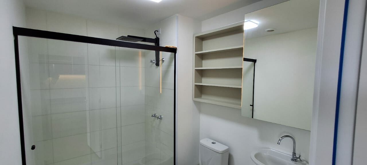 O banheiro também inspira. Com gabinete instalado, espelho amplo com armário de 2 portas espelhado, prateleiras e box de vidro instalado.