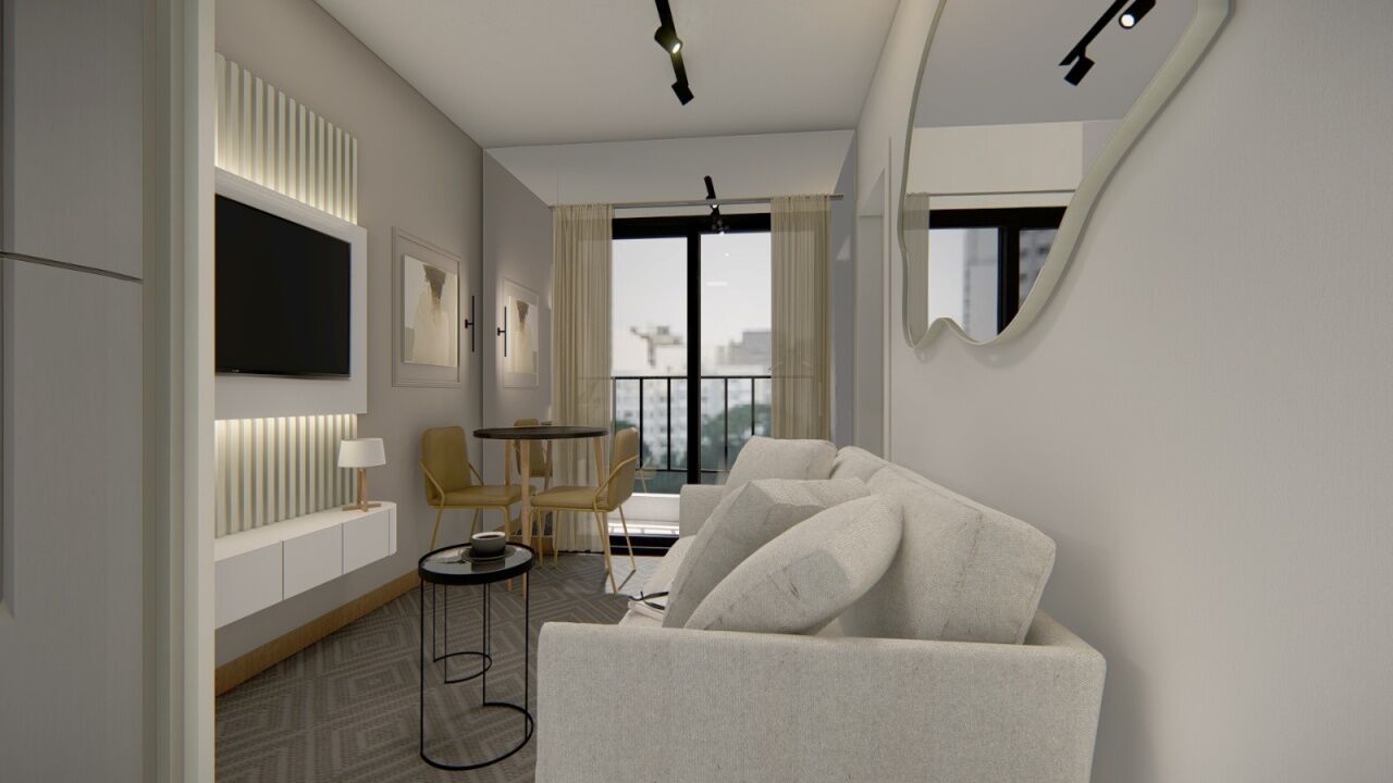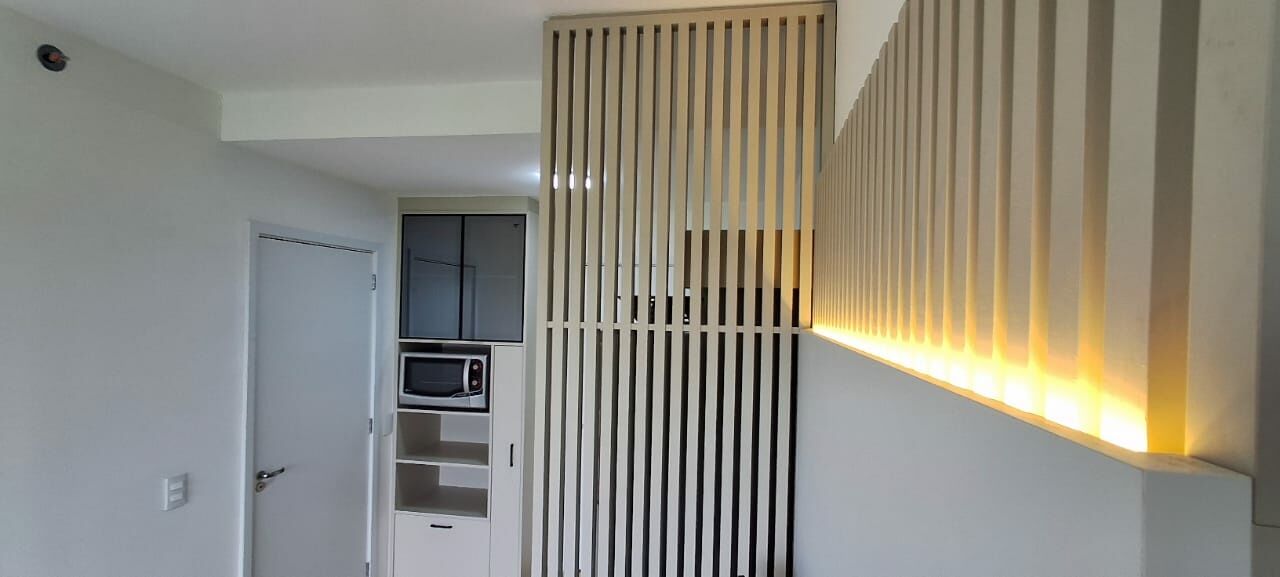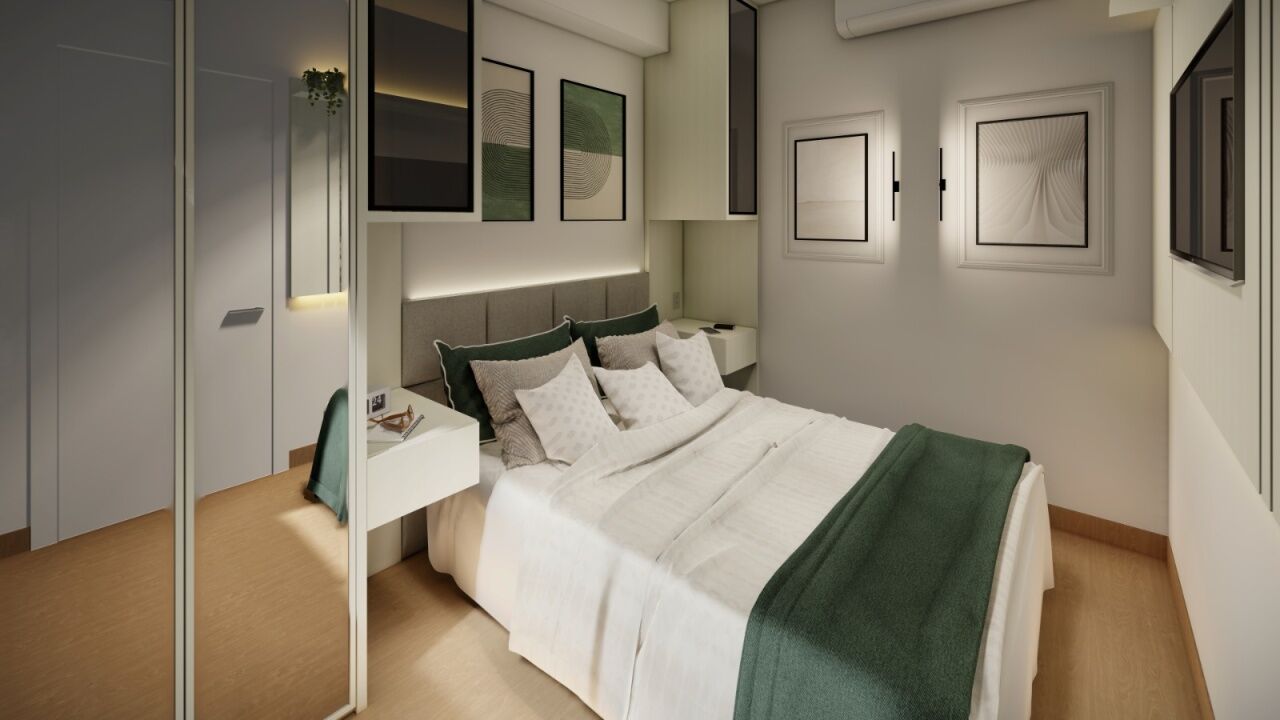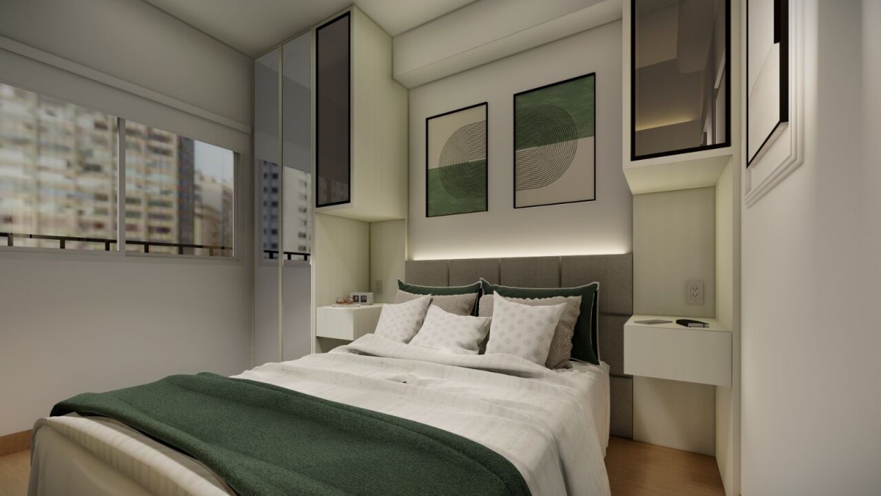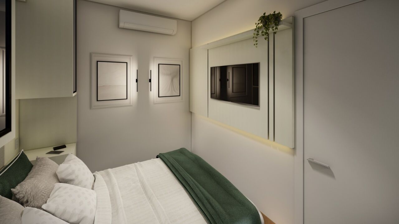 Cortinas blackout 100% instadas, uma marcenaria que possui led embutido e luz indireta para seu momento de descanso. Decoração moderna, cama e um armário bem divido e ar condicionado. Decoração ficará fiel ao projeto, com poucas possíveis alterações.