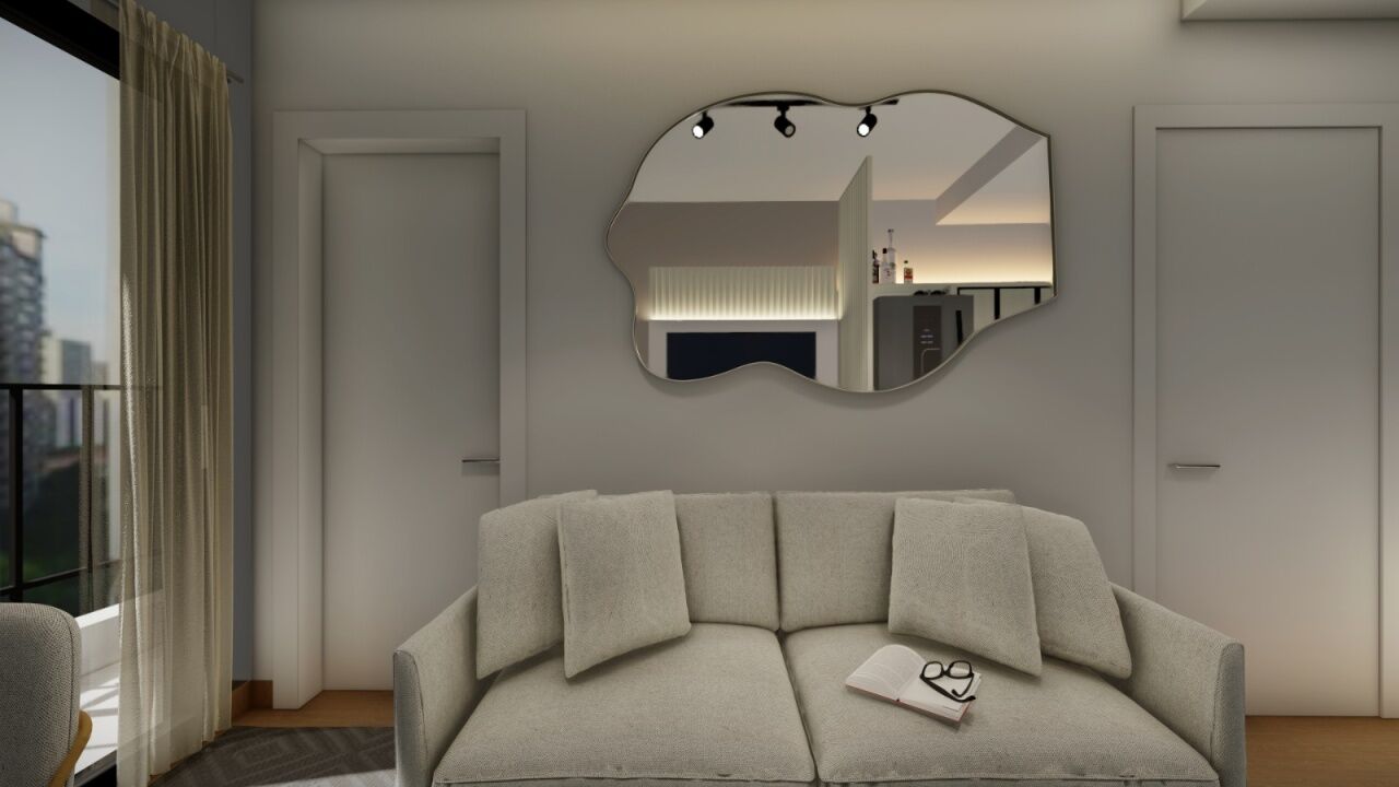 Sofá e espelhos orgânicos, cortina rack suspenso com gavetas, iluminação led indireta e painel ripado. Decoração ficará bem fiel ao projeto das fotos.