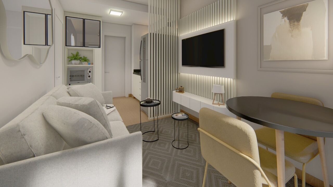 Em piso vinilico, com projeto diferenciado em marcenaria a ser concluído final de janeiro. A sala possuirá uma decoração moderna com sofá, mesa, rack e TV.