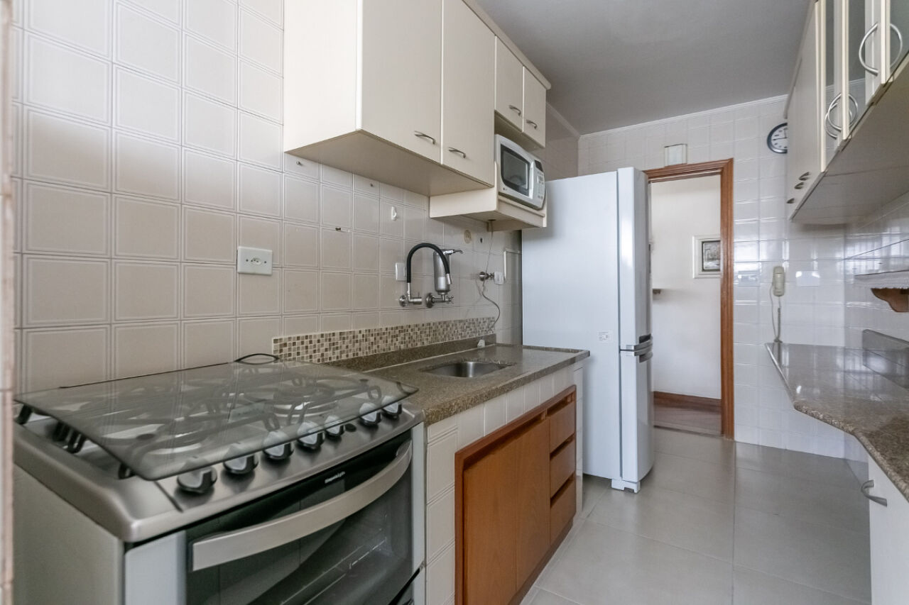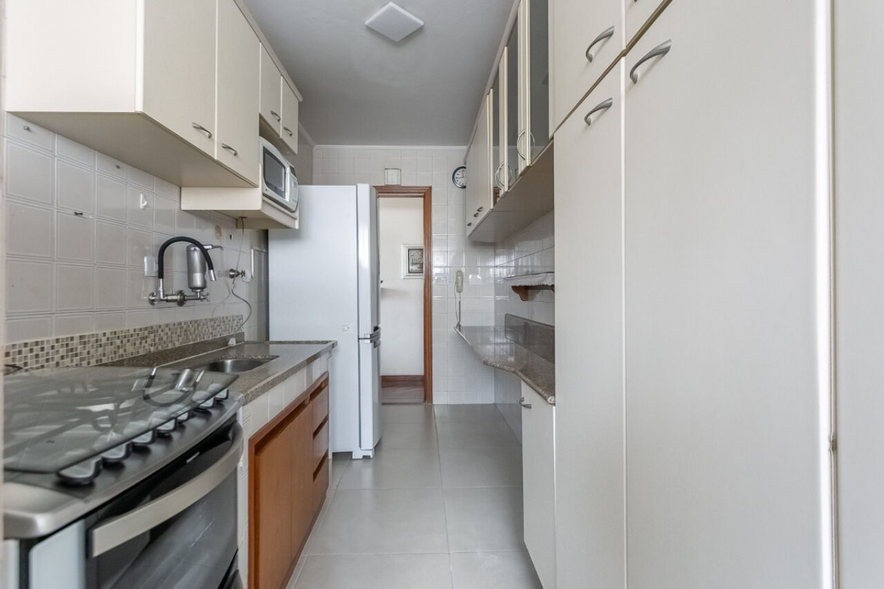 Cozinha com armário embutido, iluminação natural e bem distribuída com área de serviço.
