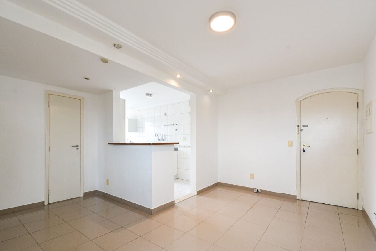 Apartamento de 84m2 com ampla sala para dois ambientes, cozinha aberta e lavabo.