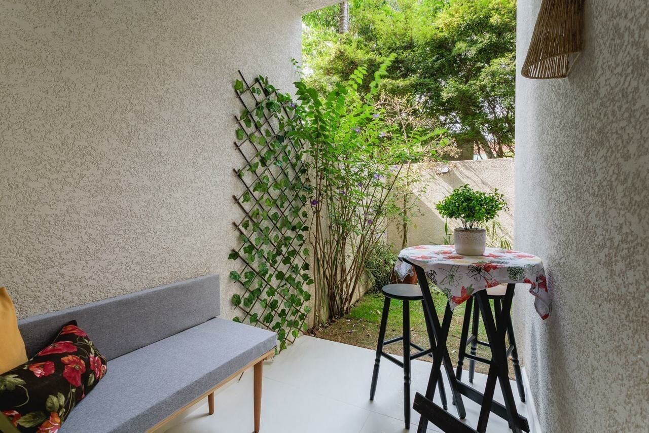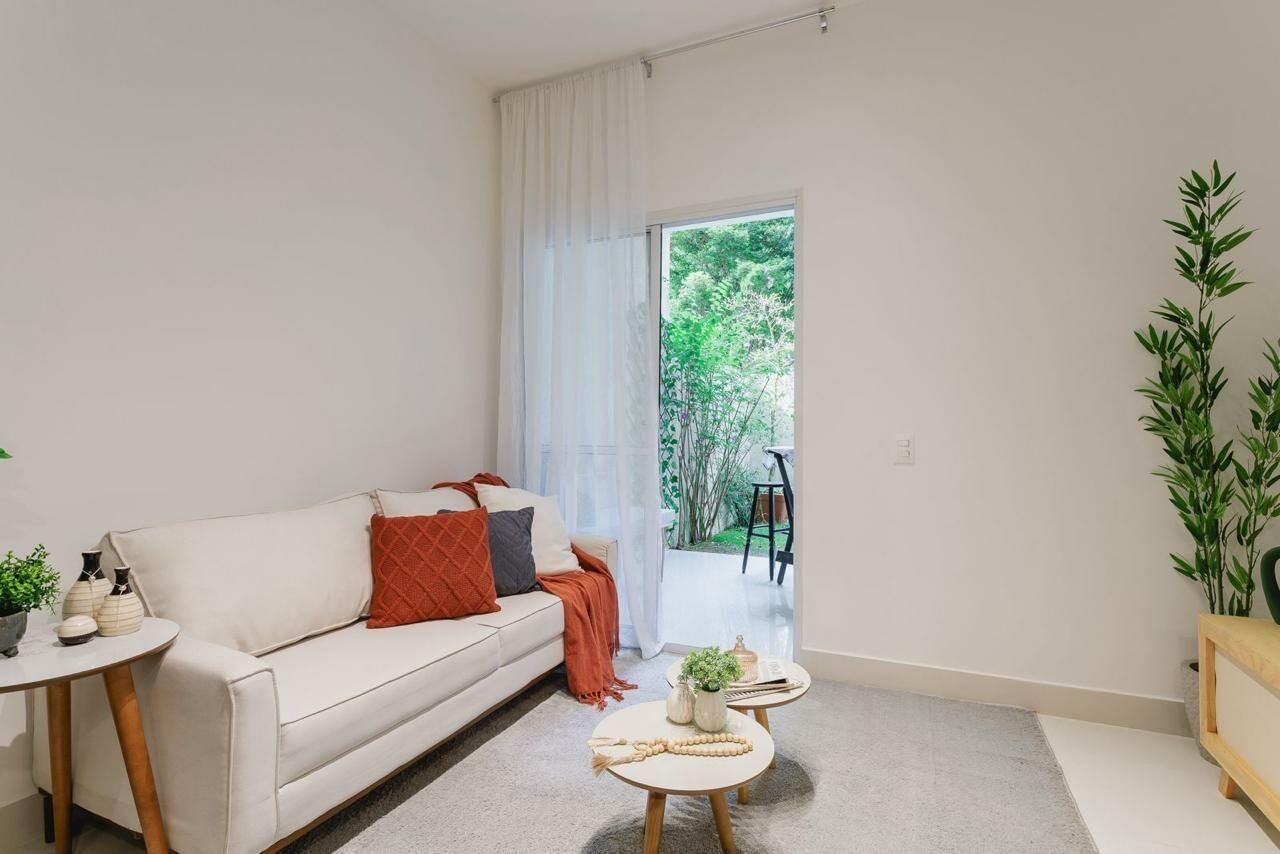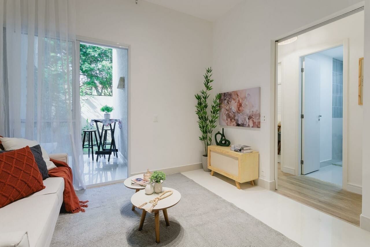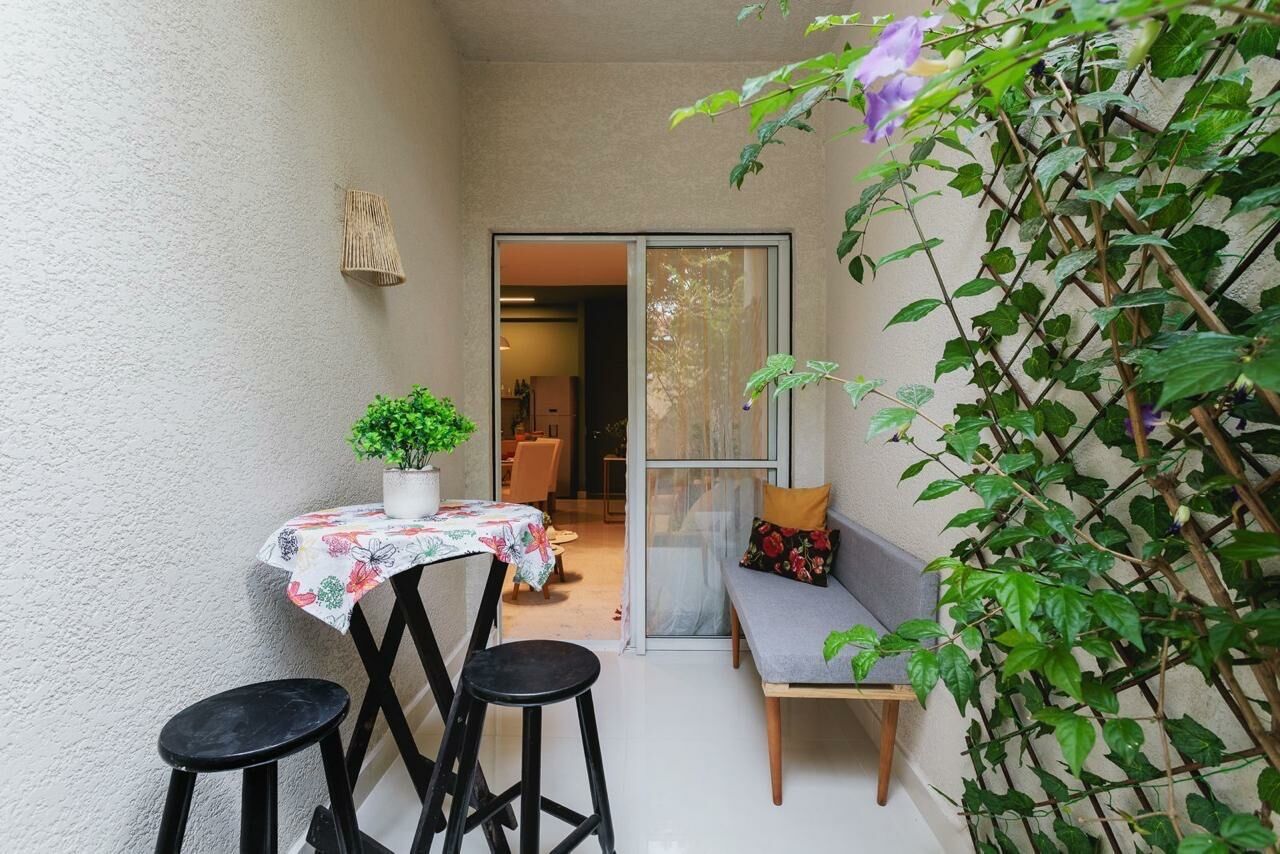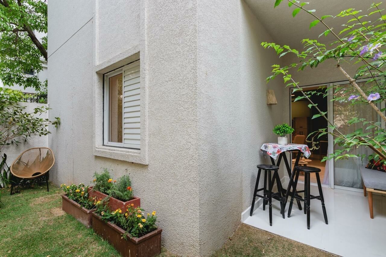 Apartamento Garden de 79 m², sala para dois ambientes, 3 quartos, sendo 1 suíte, varanda, 2 banheiros, cozinha tipo americana e área de serviço.