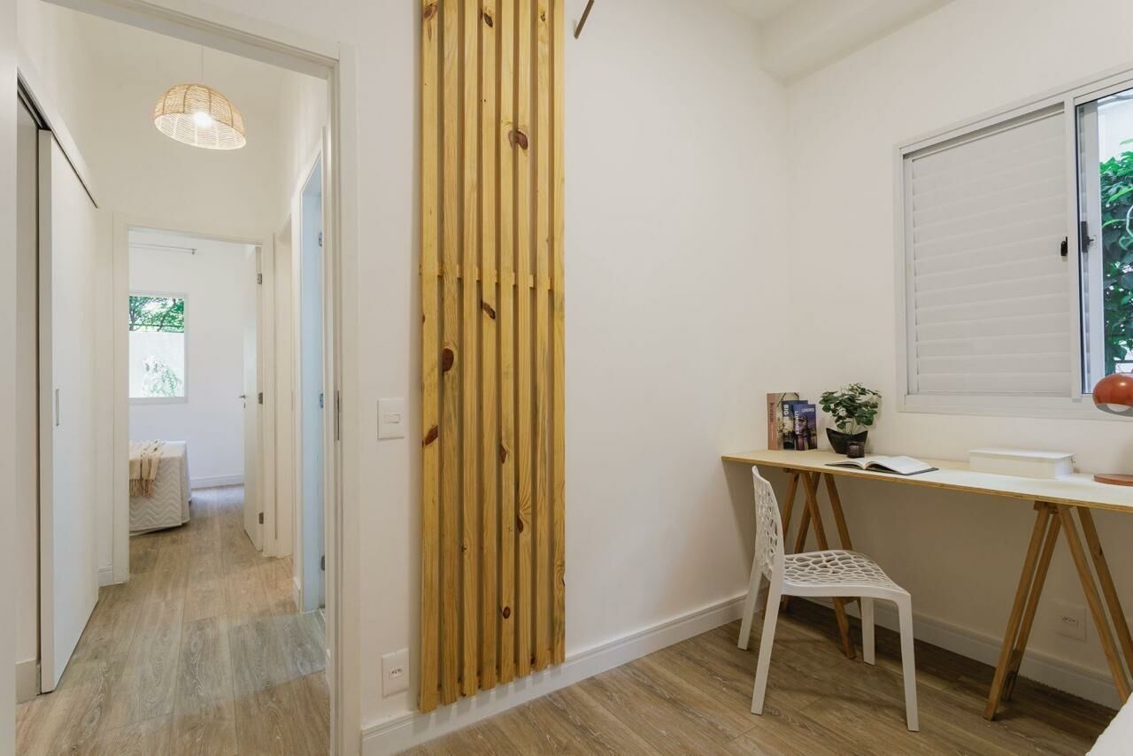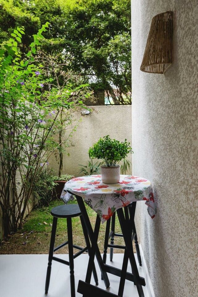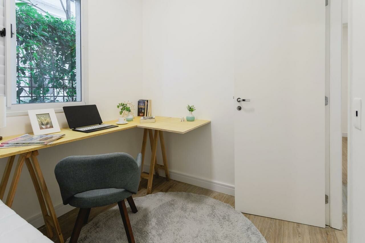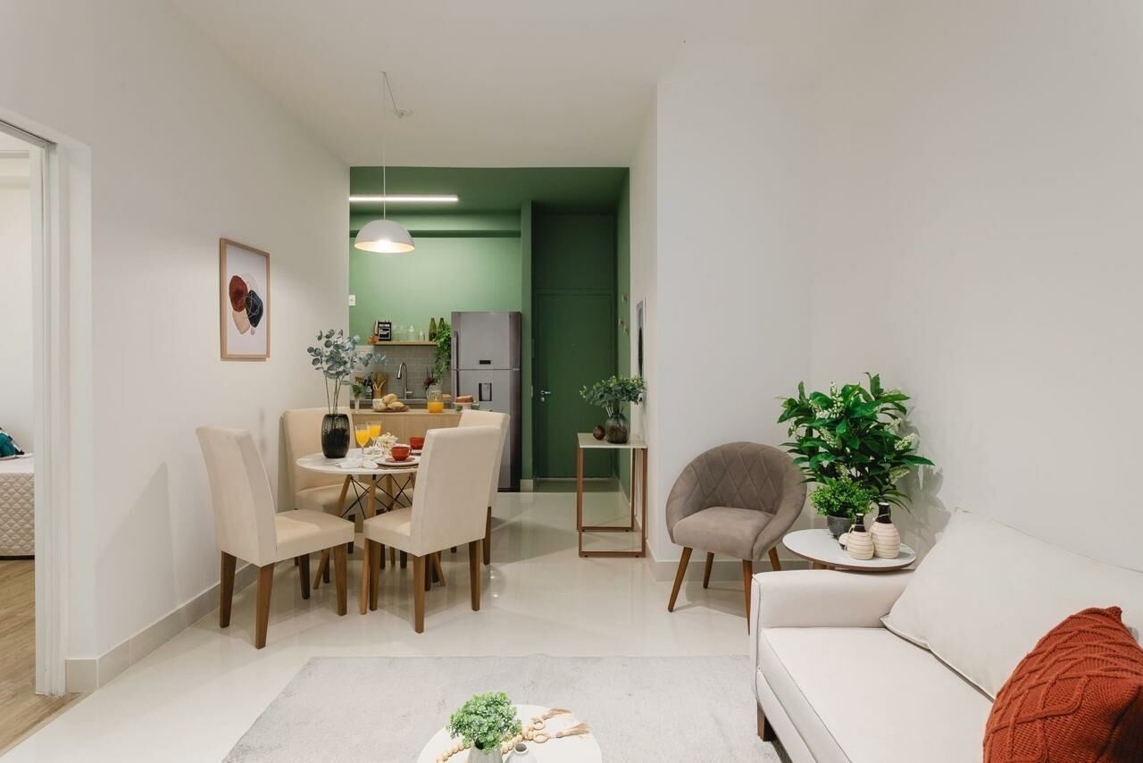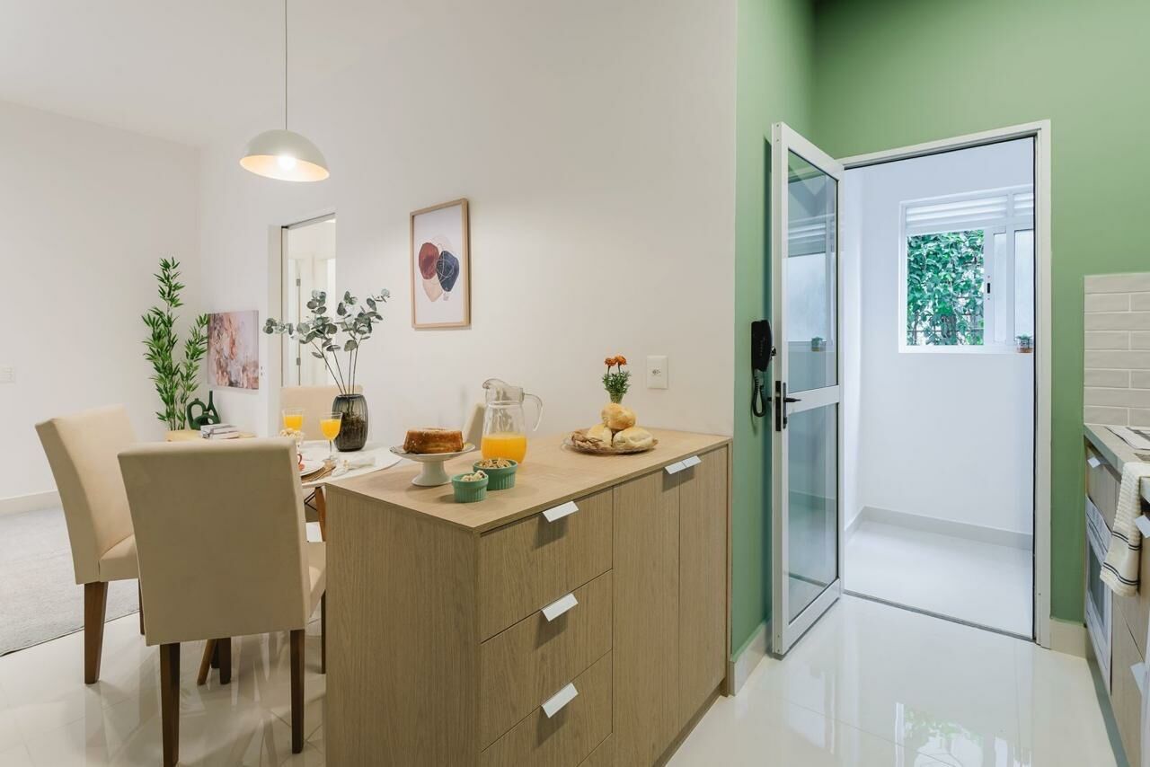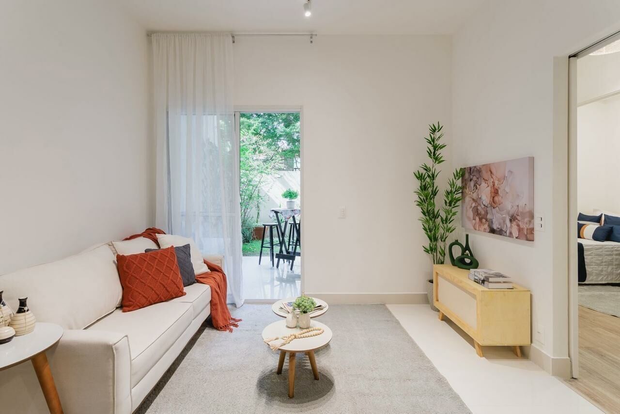 Apartamento Garden de 79 m², sala para dois ambientes, 3 quartos, sendo 1 suíte, varanda, 2 banheiros, cozinha tipo americana e área de serviço.