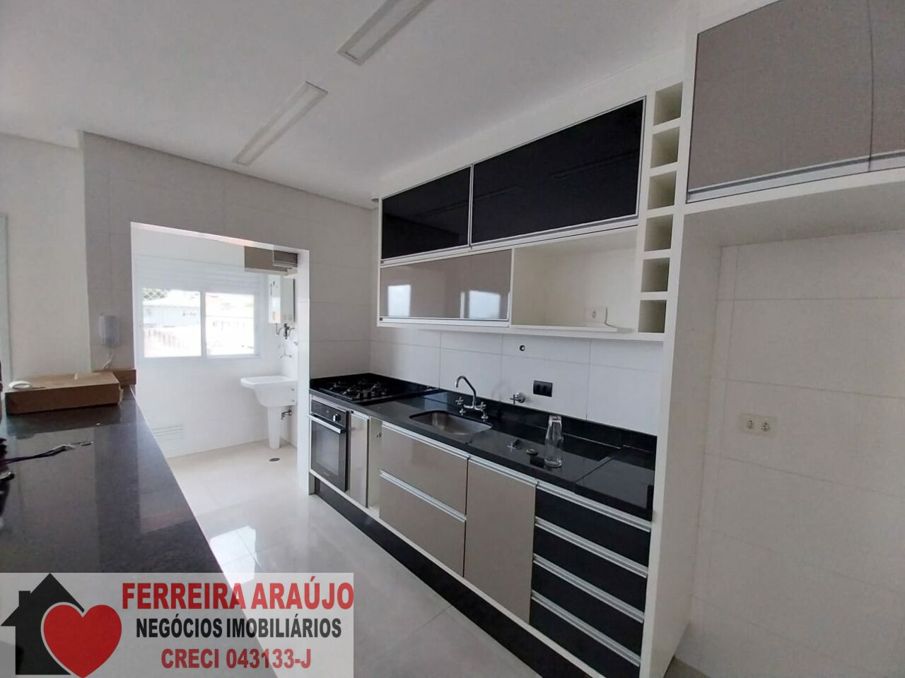 Cozinha estilo americana com armários, fogão, forno e acesso à área de serviço, que também se comunica com a varanda em planta super moderna.