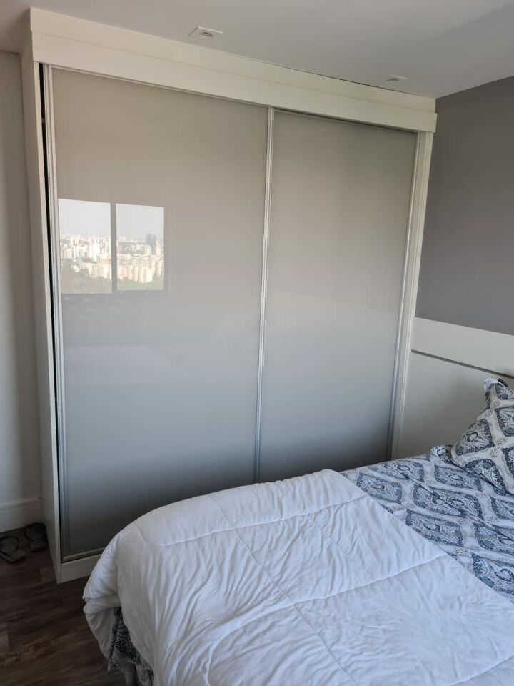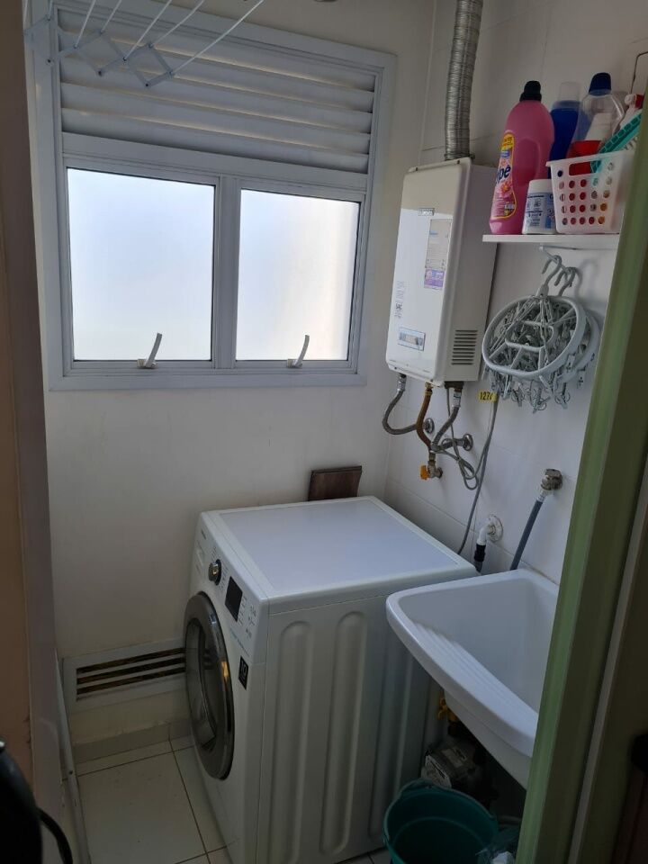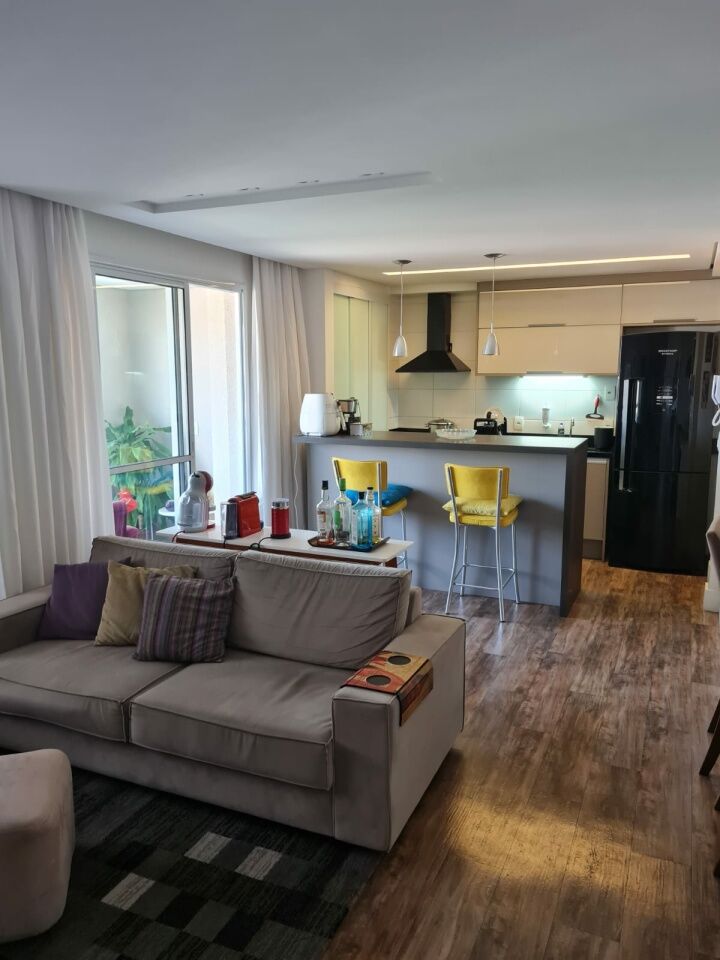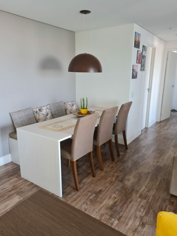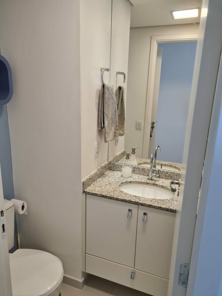 Apartamento de 64m com 2 quartos com 1 suite e 2 banheiros com a suite. Varanda e área de serviço. Imóvel com móveis planejados nos banheiros quartos, cozinha e sala com mesa de jantar. Piso vinilico, teto rebaixado de gesso e luzes de led.
