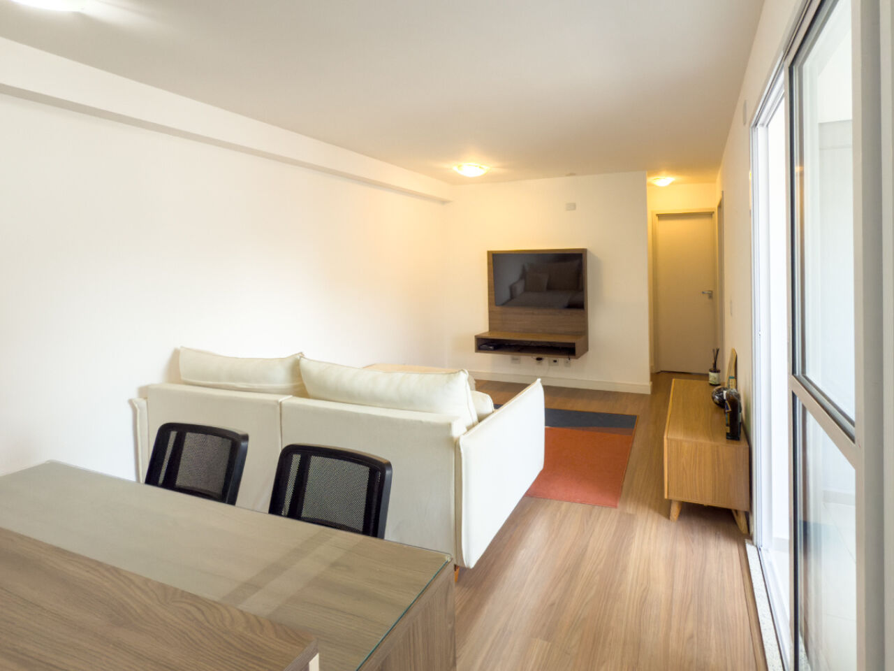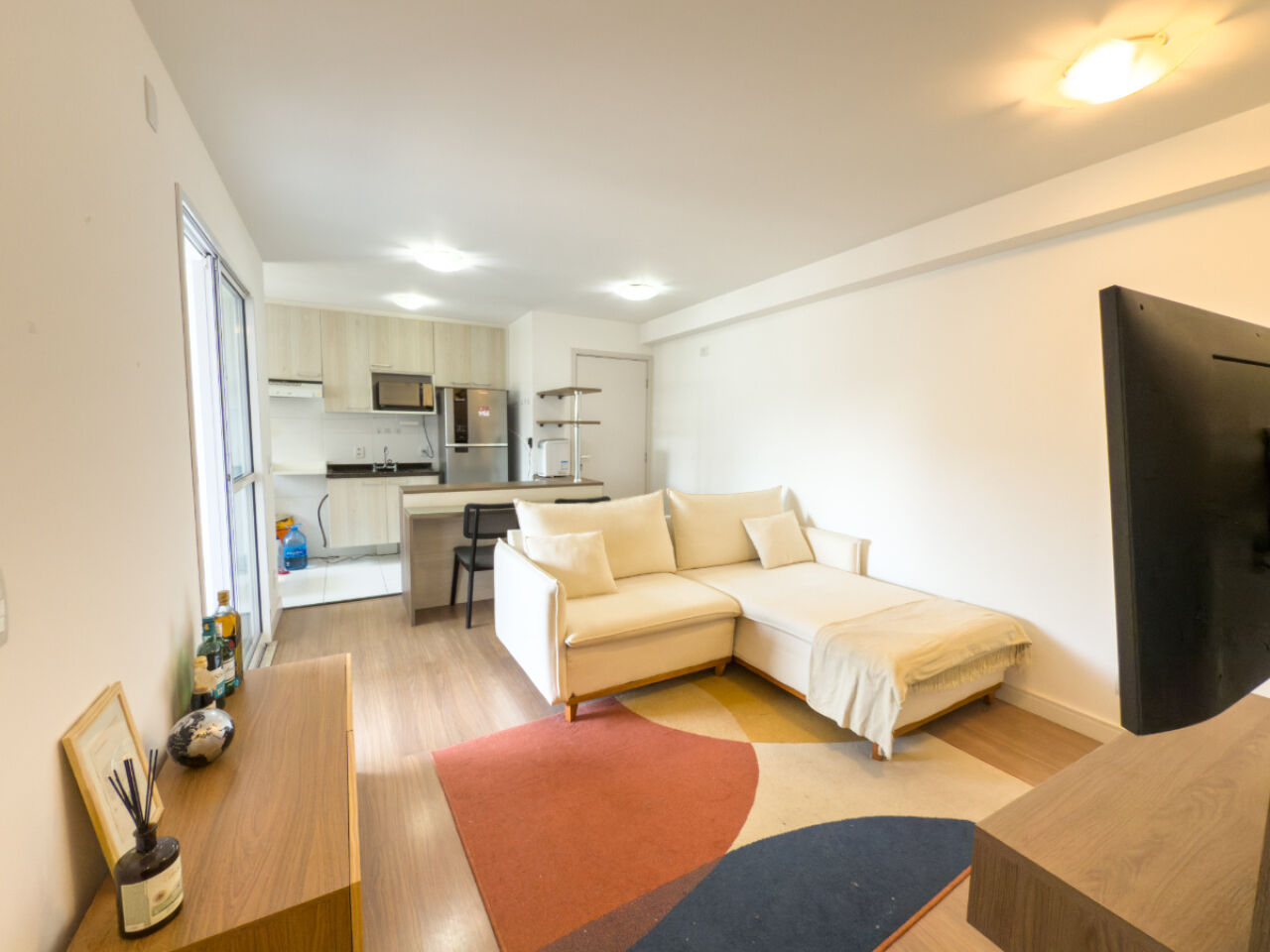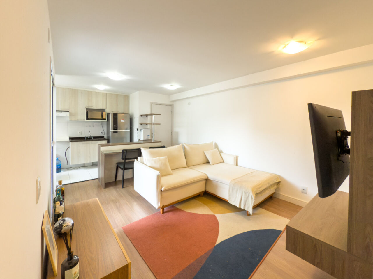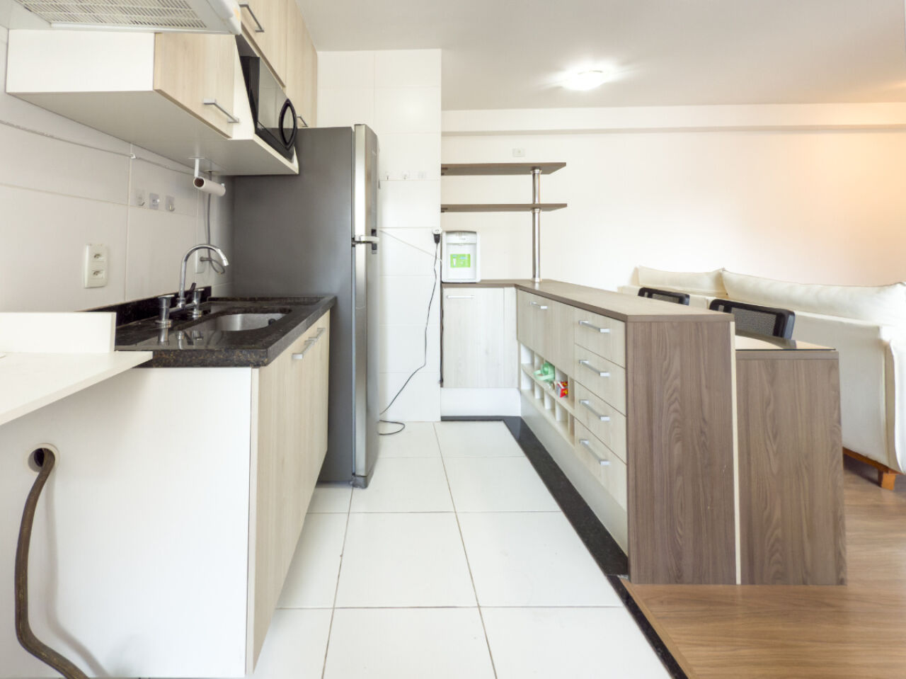 Sala em estilo living ampliado integrada com uma cozinha americana, com armários planejados.