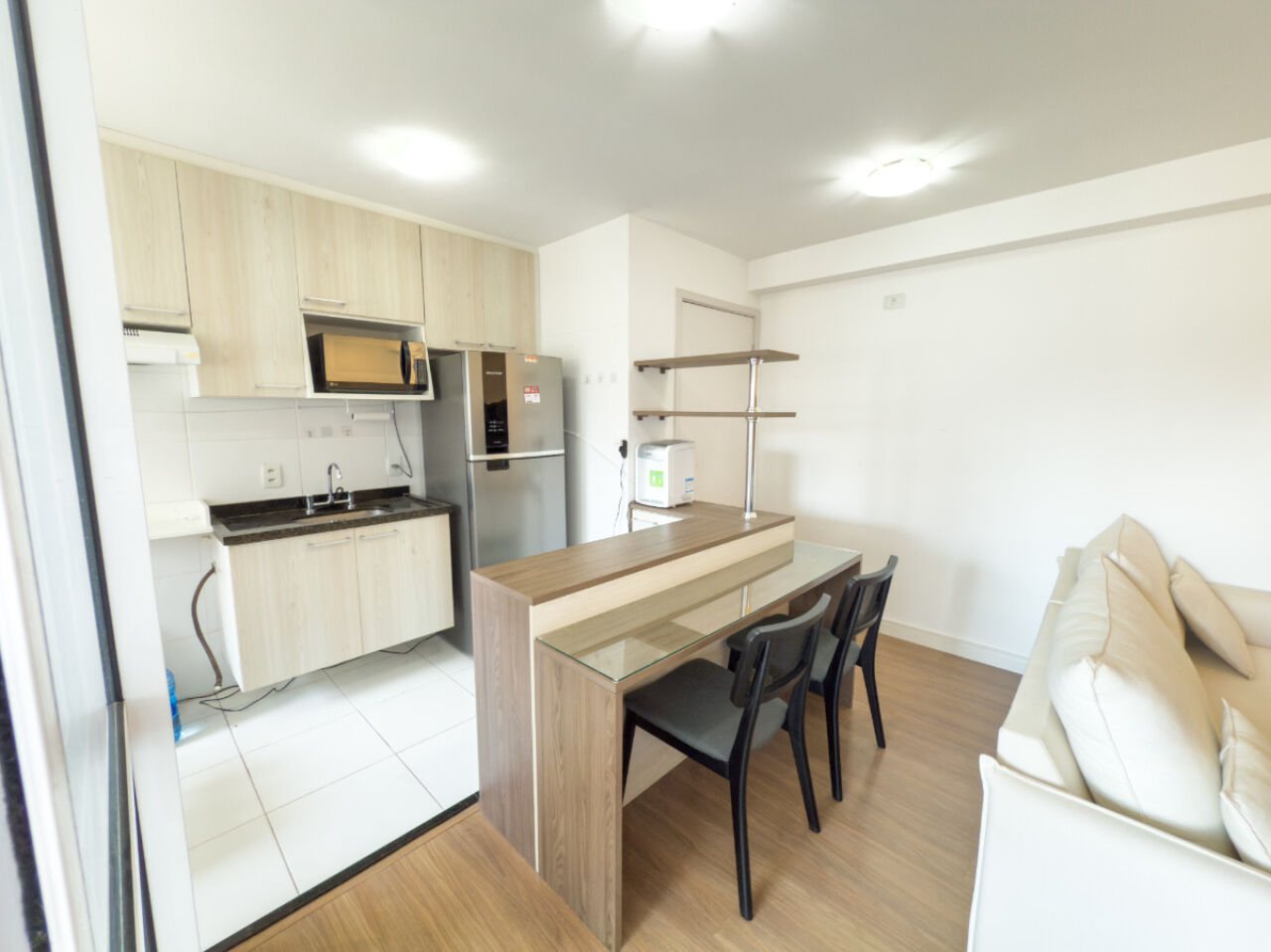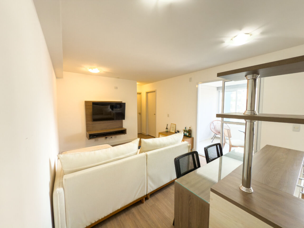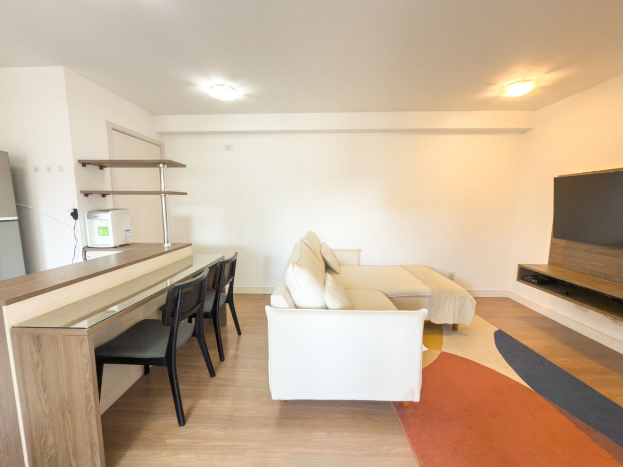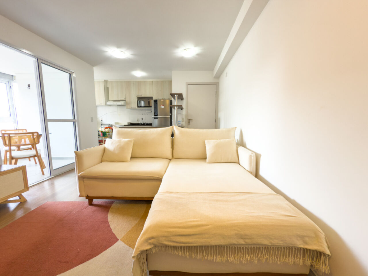 Sala em estilo living ampliado integrada com uma cozinha americana, com armários planejados.