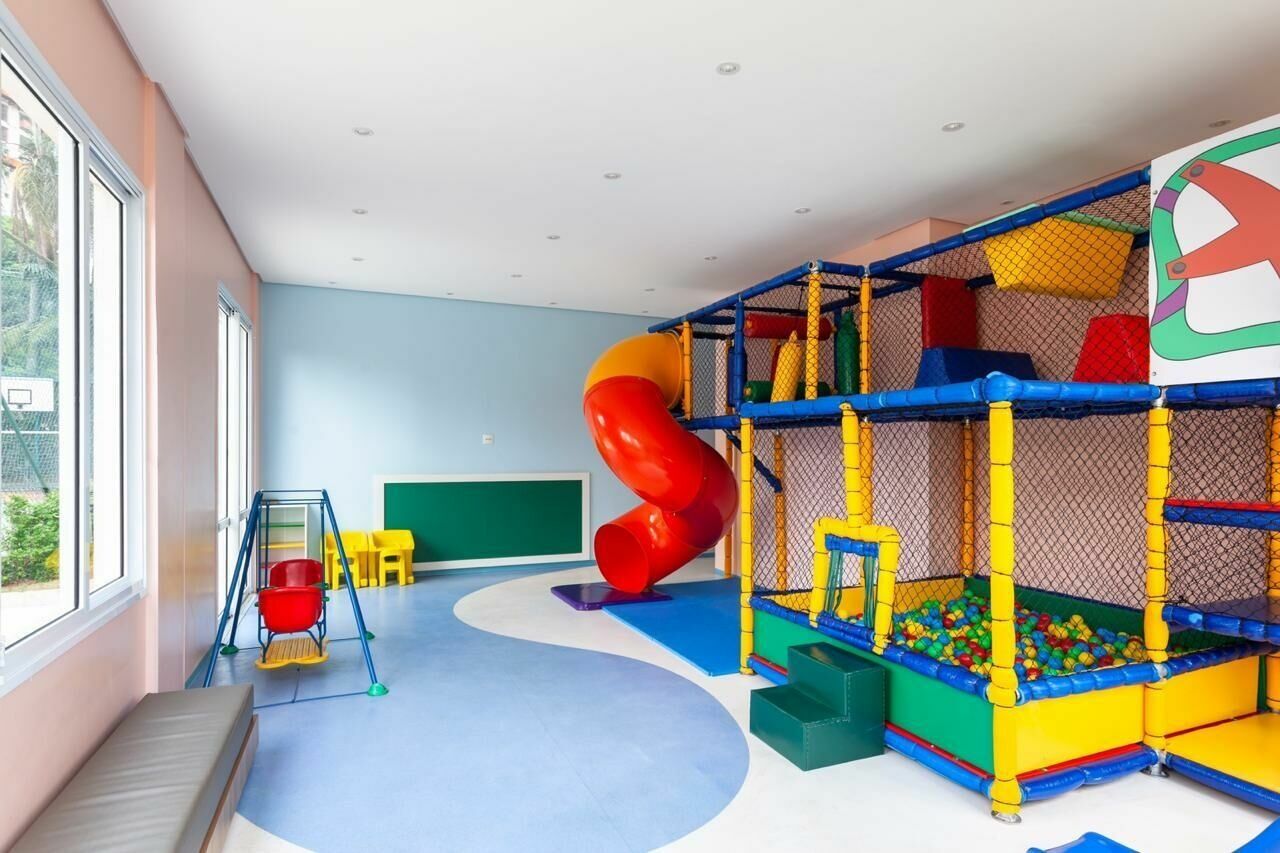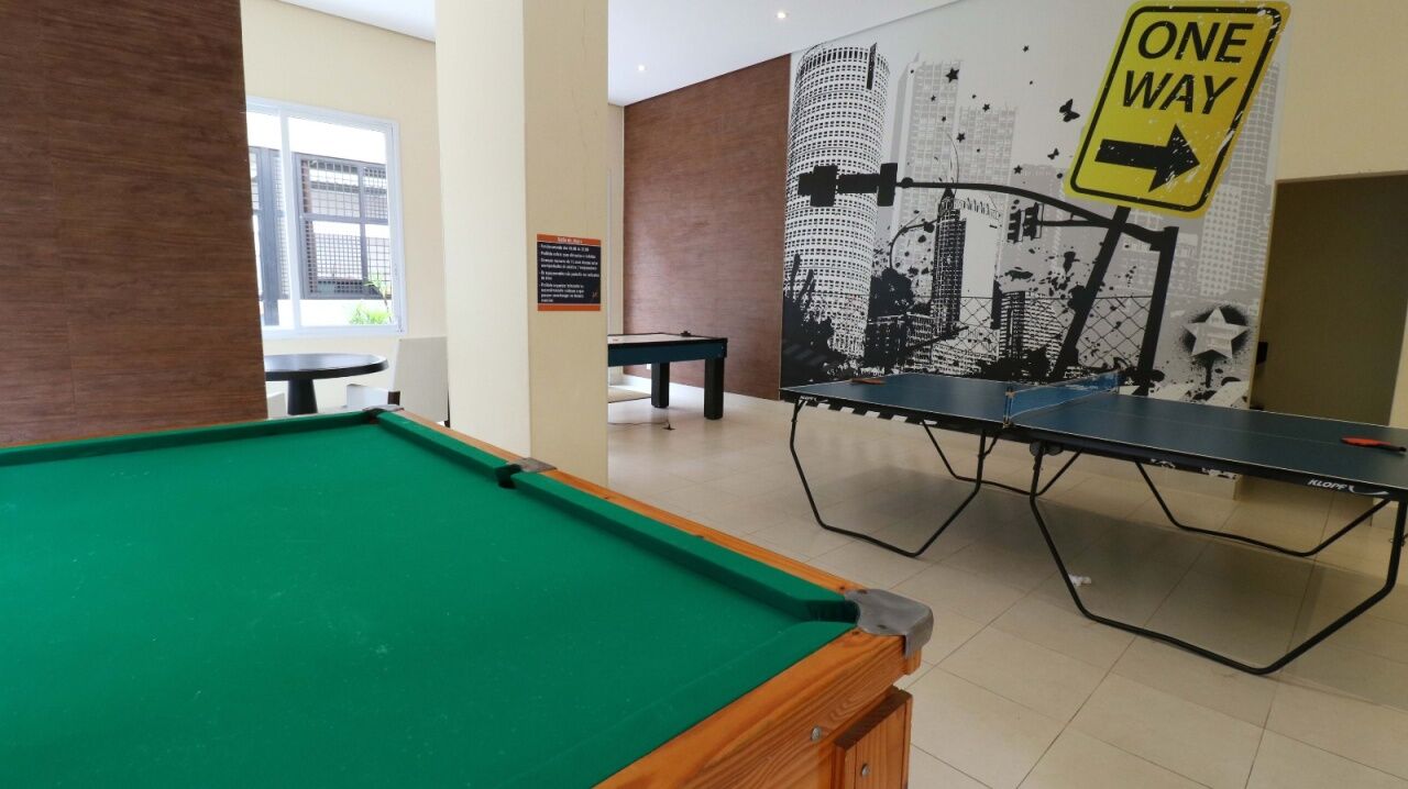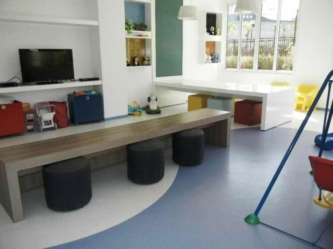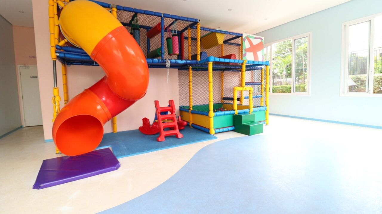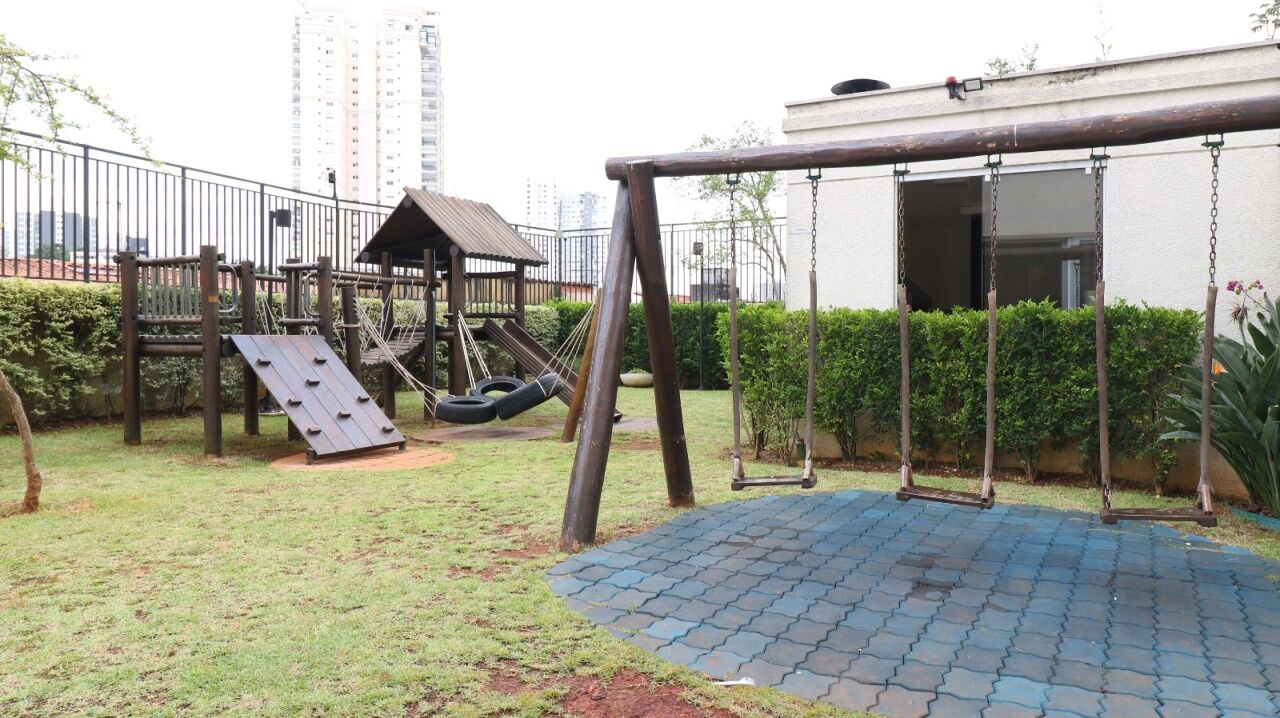 Condomínio com lazer completo, academia, piscina, brinquedoteca, playground, quadra de esportes, churrasqueira, forno de pizza