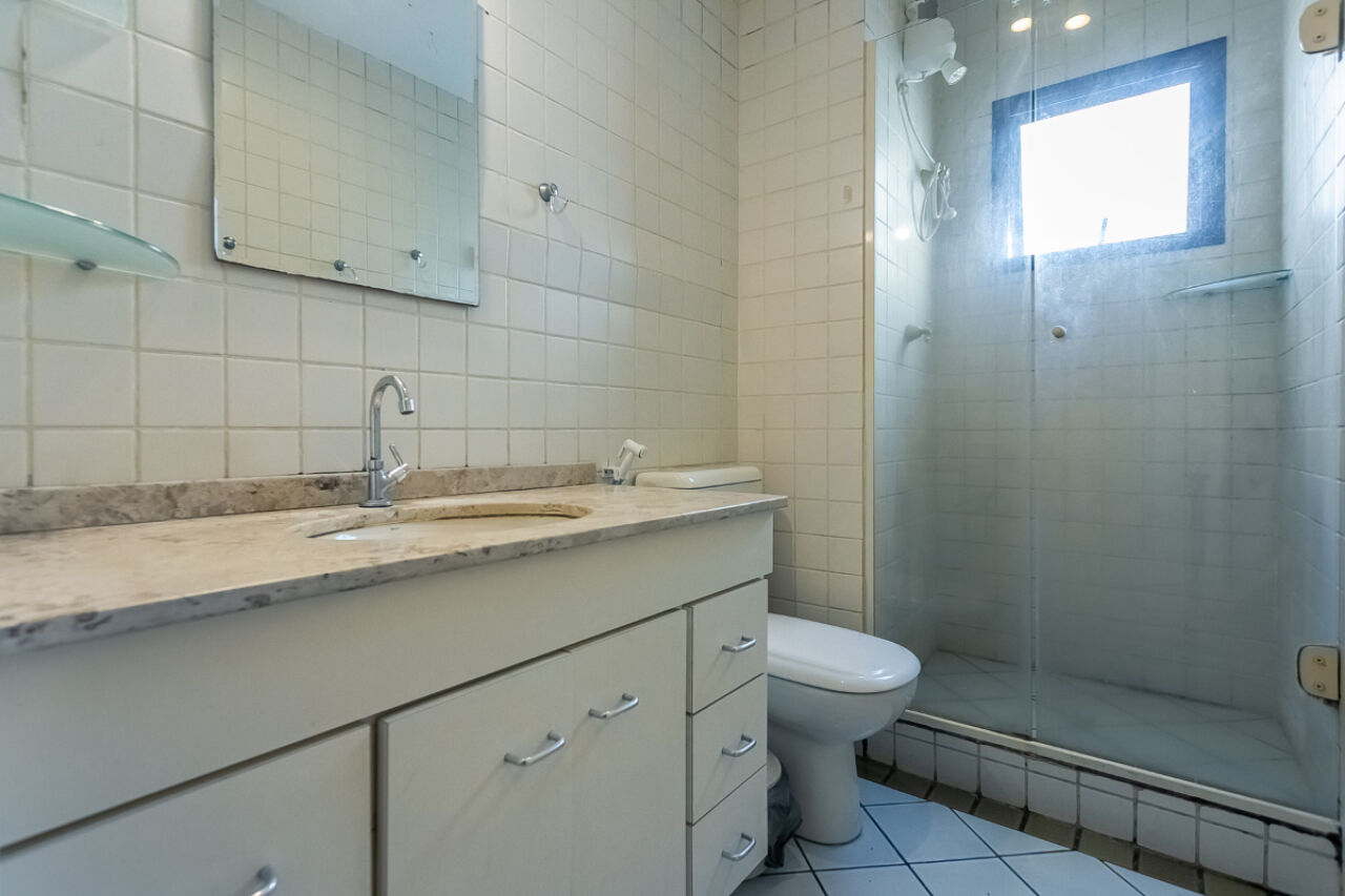 O banheiro possui chuveiro a gás e ventilação natural, oferecendo mais conforto e economia no dia a dia.