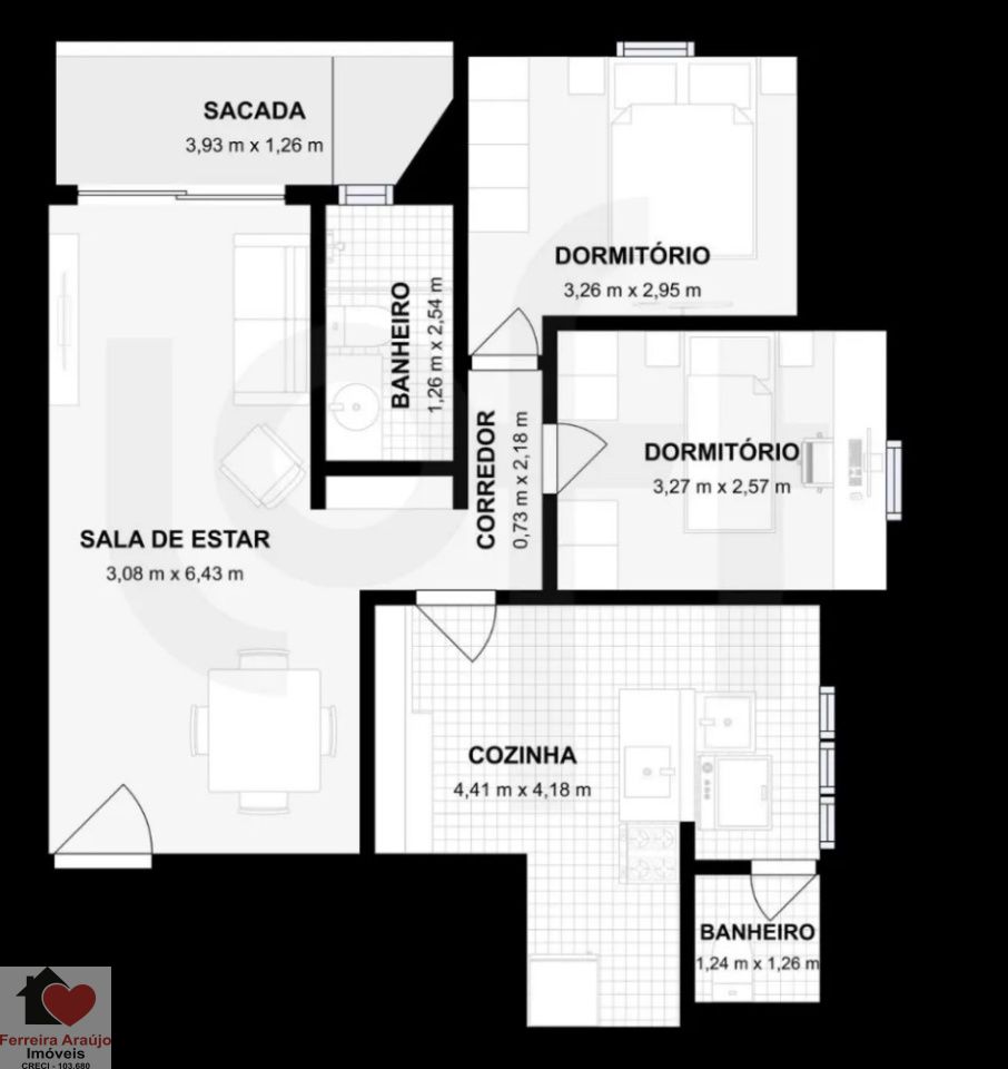 2 dormitórios, 1 vaga, 2 banheiros, sacada, área de serviço com banheiro e cozinha ampla.