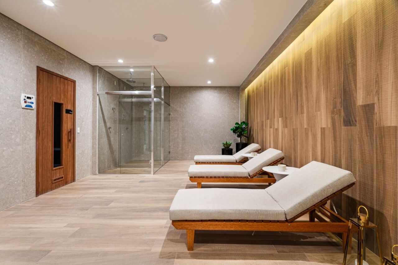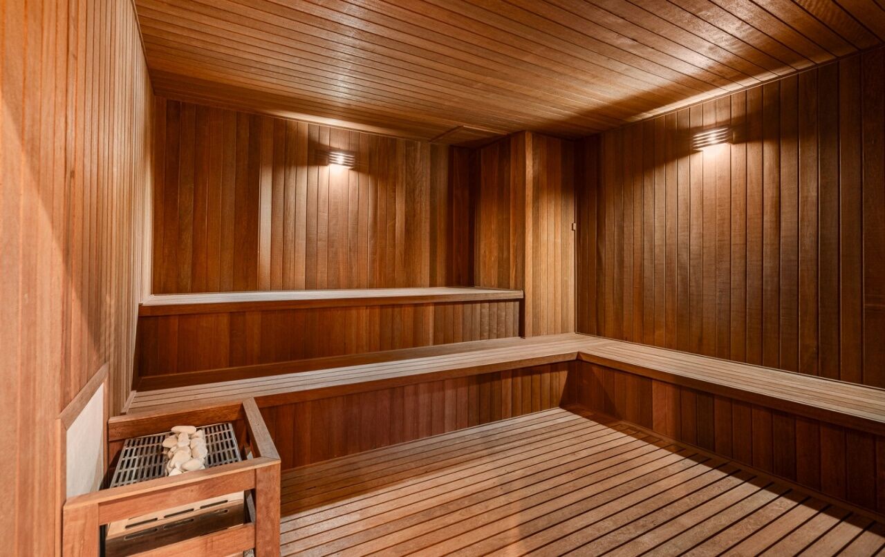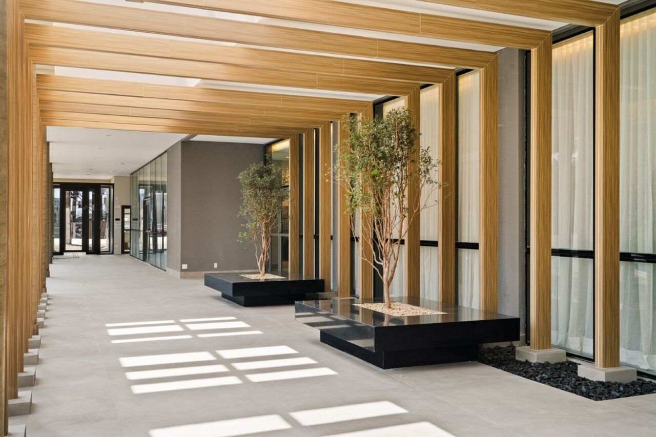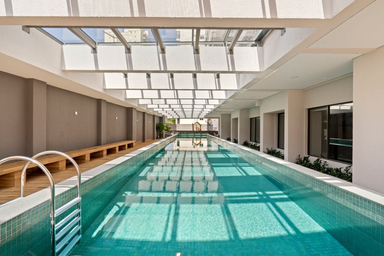 Prédio moderno com piscina e segurança.