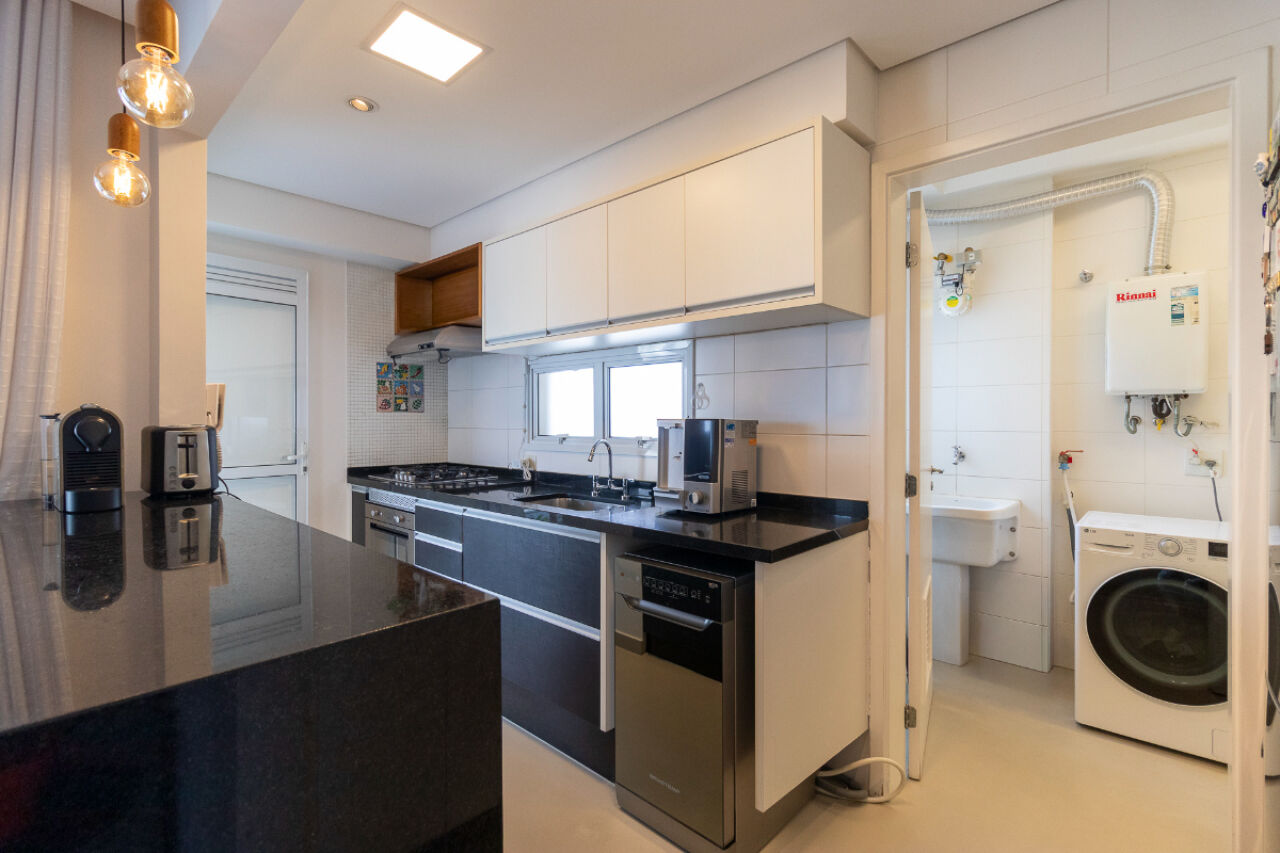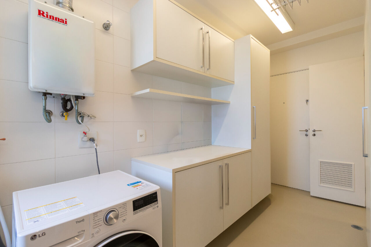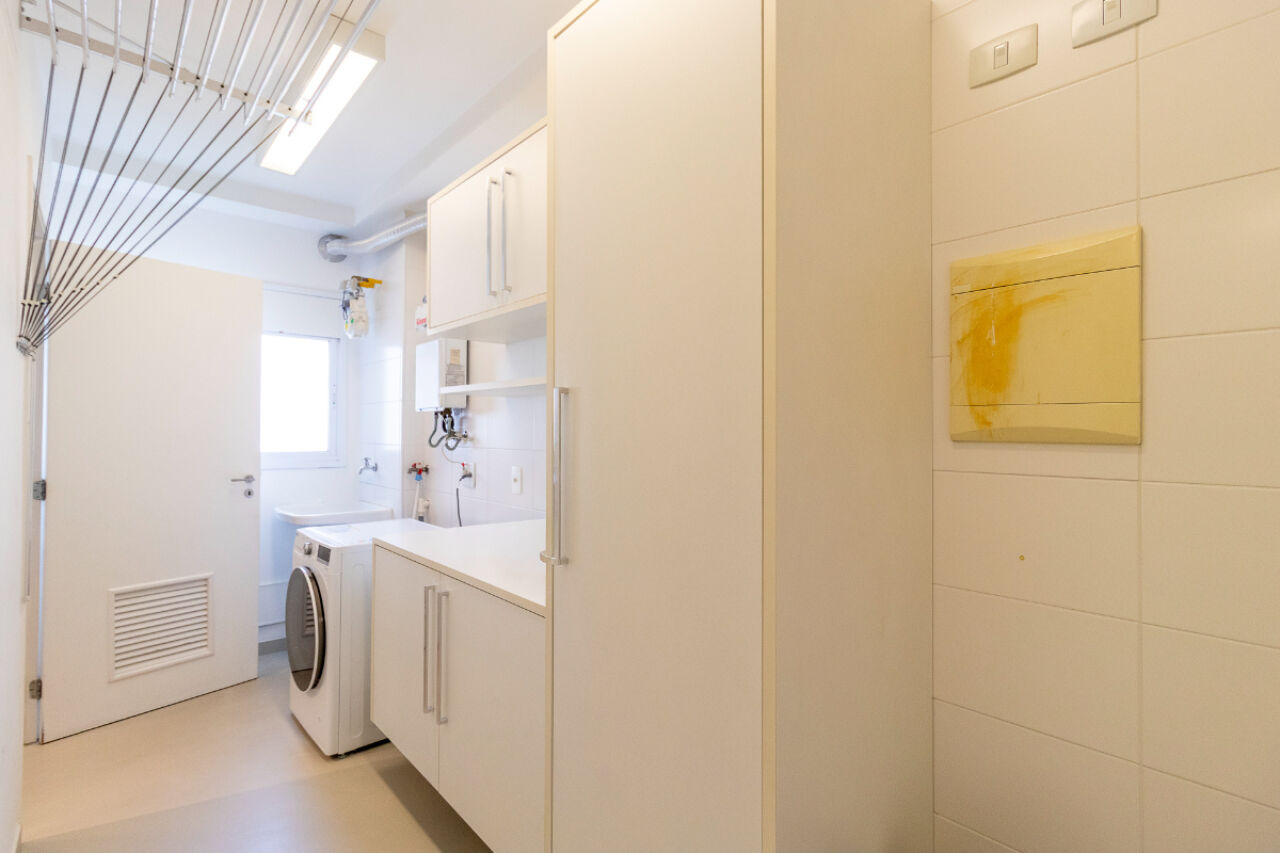 infraestrutura para ar-condicionado. A cozinha é equipada com despensa e depósito, enquanto a área de serviço com banheiro próprio.