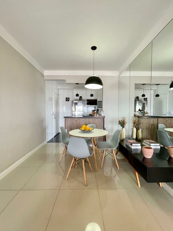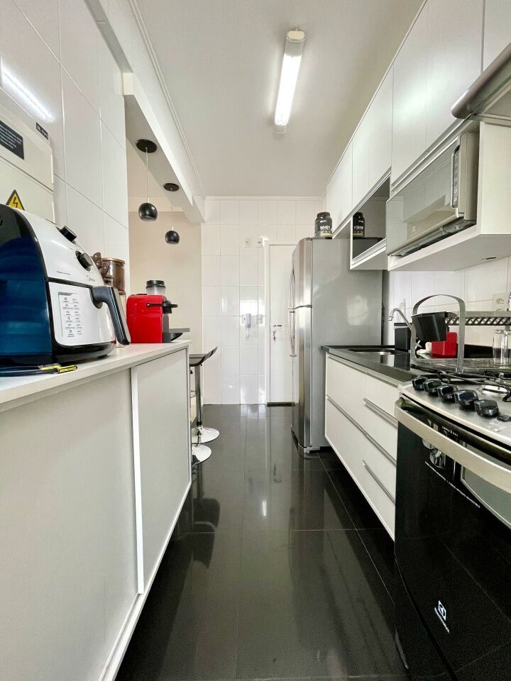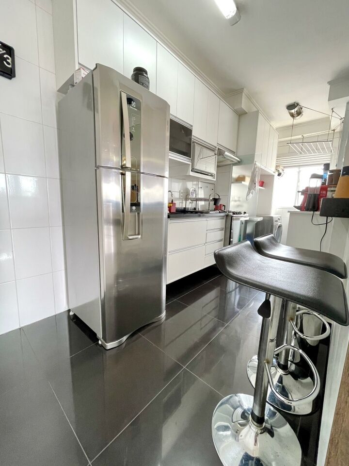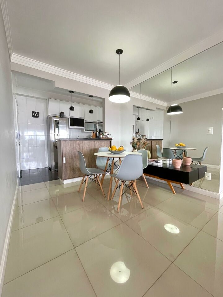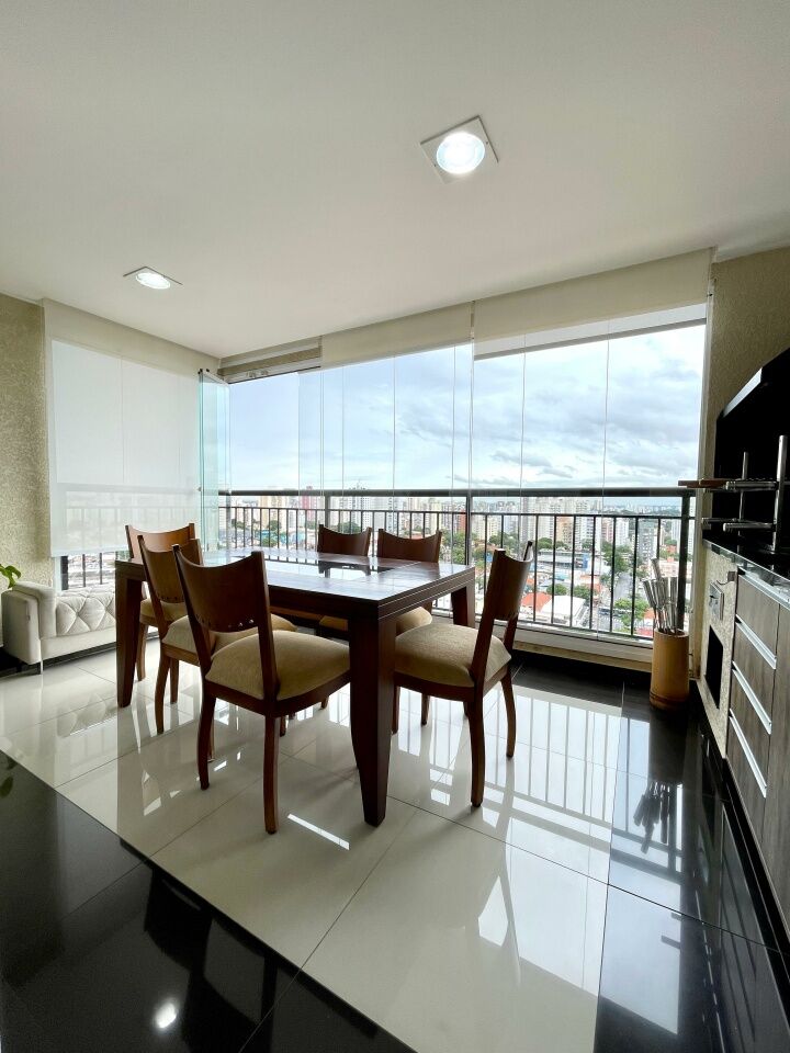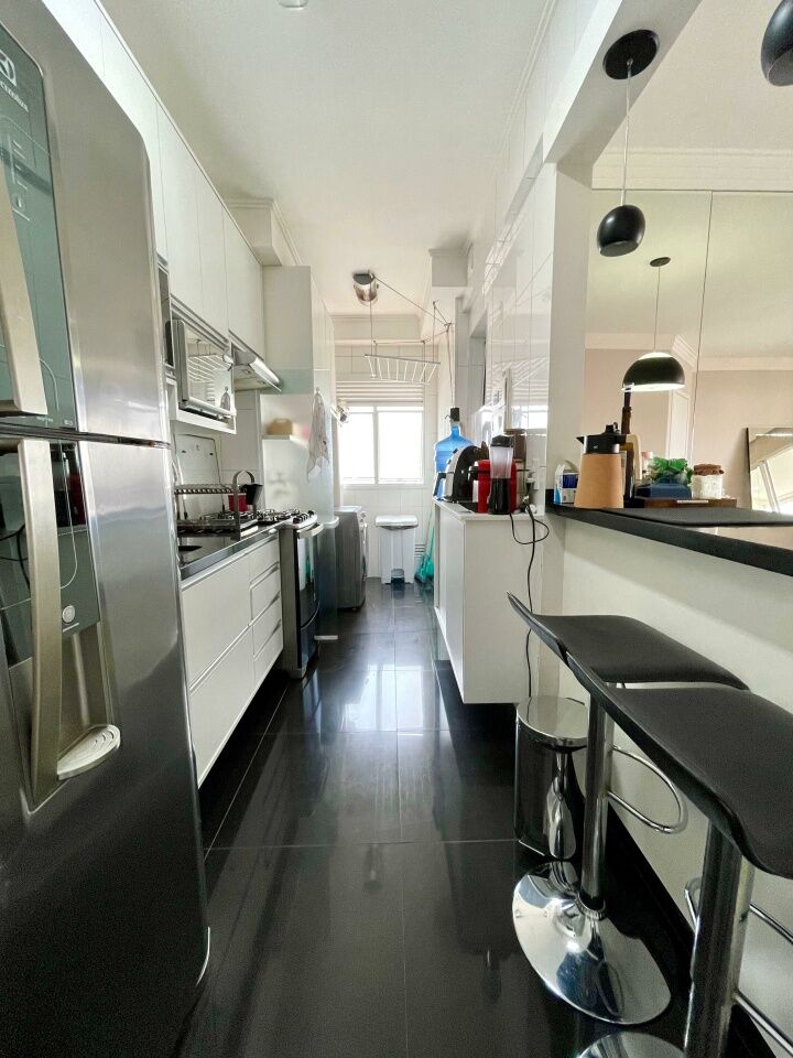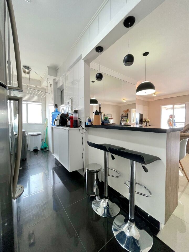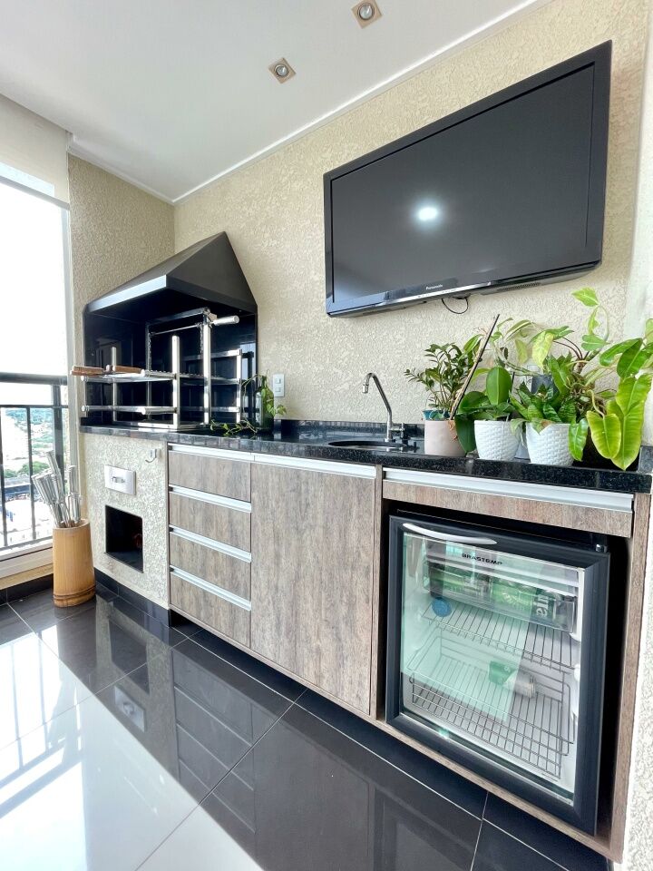 Apartamento com varanda gourmet, moderno, cozinha estilo americana e área de serviço.