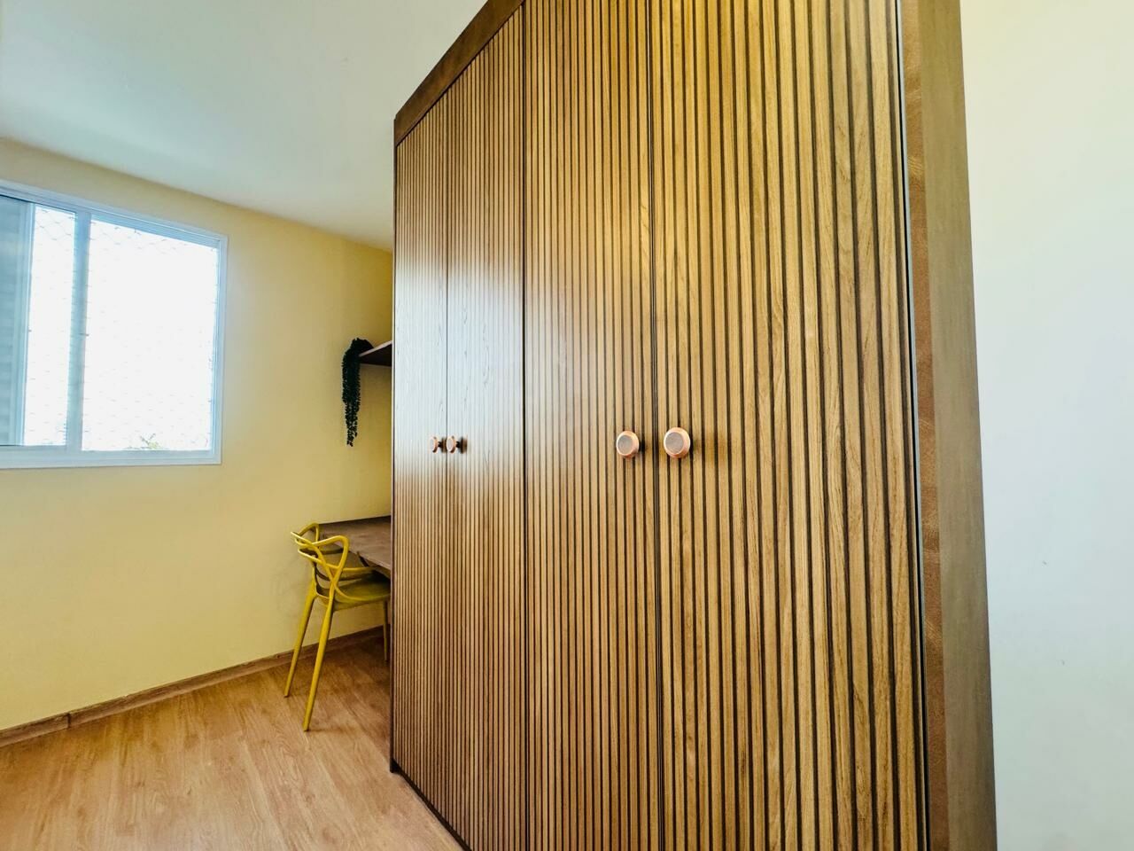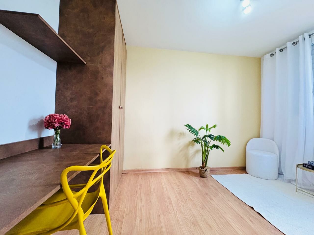 Planta Flexível: Configuração atual com 2 dormitórios, sendo 1 suíte e sala ampliada. O projeto permite a reversão fácil para 3 dormitórios (1 suíte), aproveitando ao máximo a iluminação natural e o espaço.