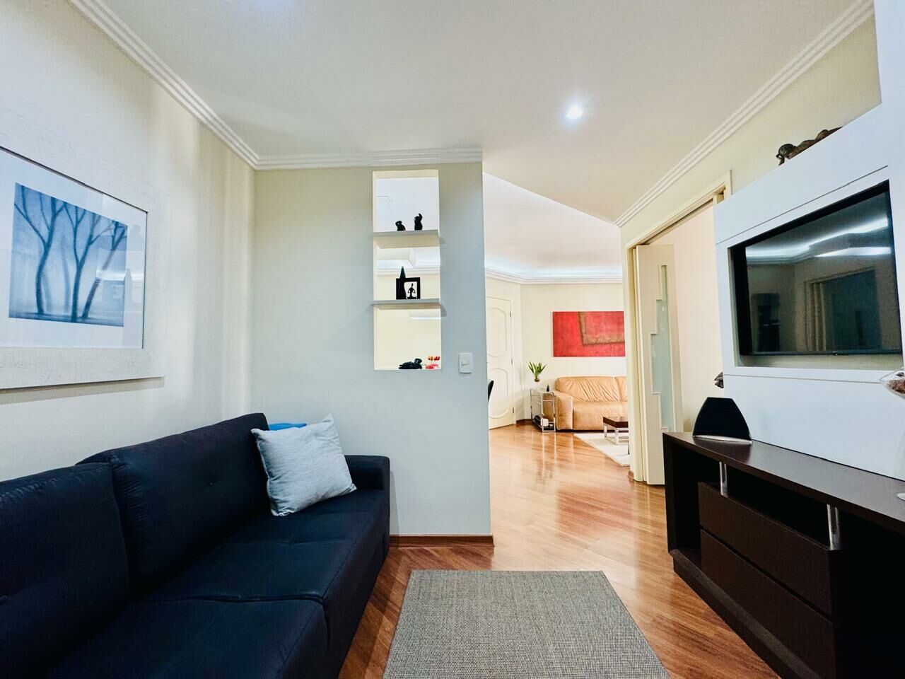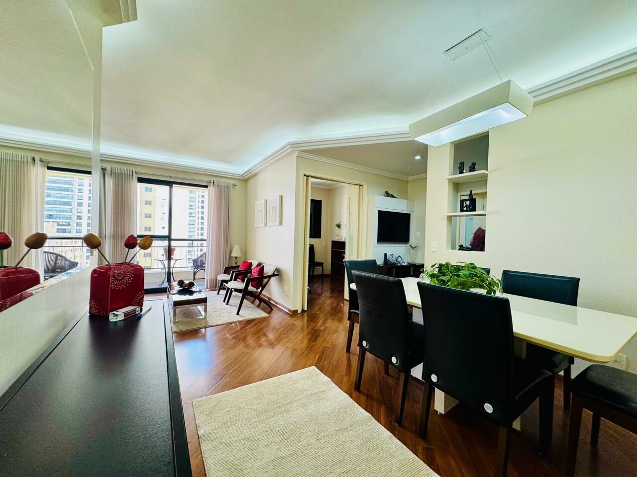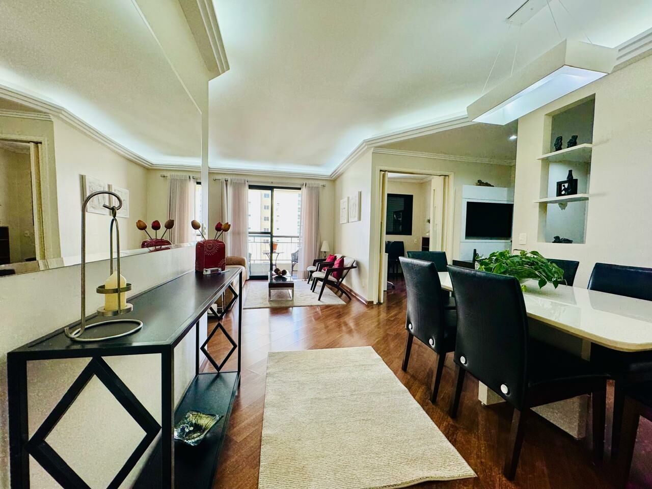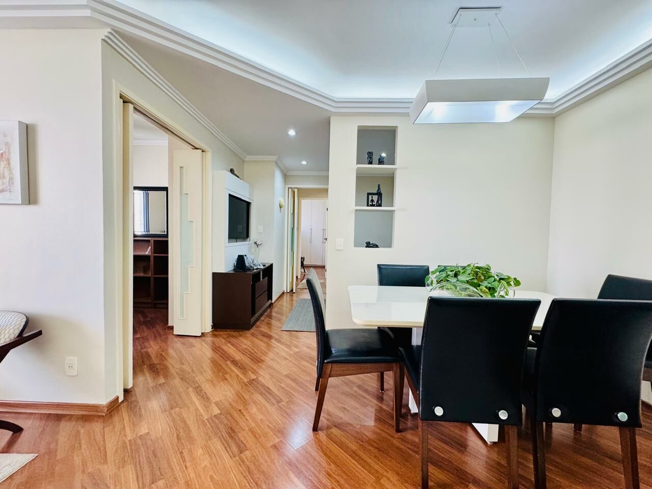 Planta Customizada: Originalmente com 4 dormitórios, foi inteligentemente atualizado para 3 dormitórios (1 suíte), privilegiando a amplitude da sala de TV.
