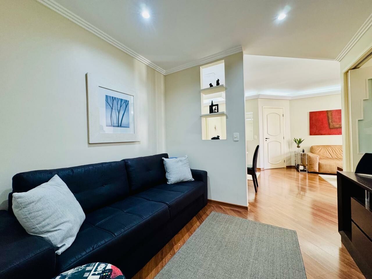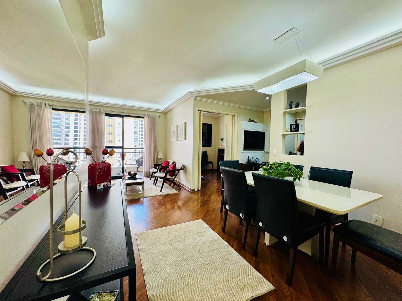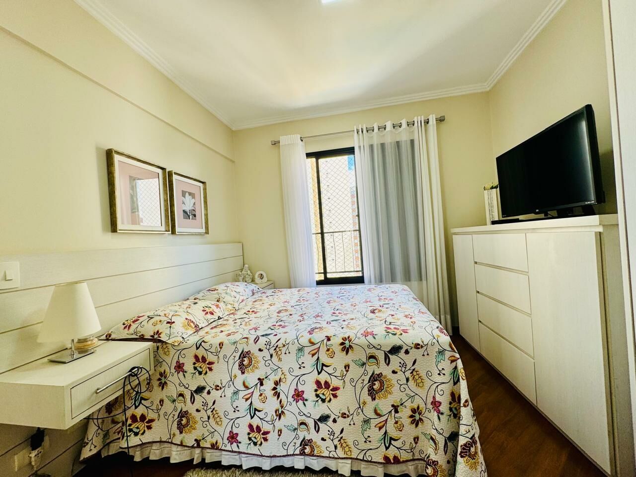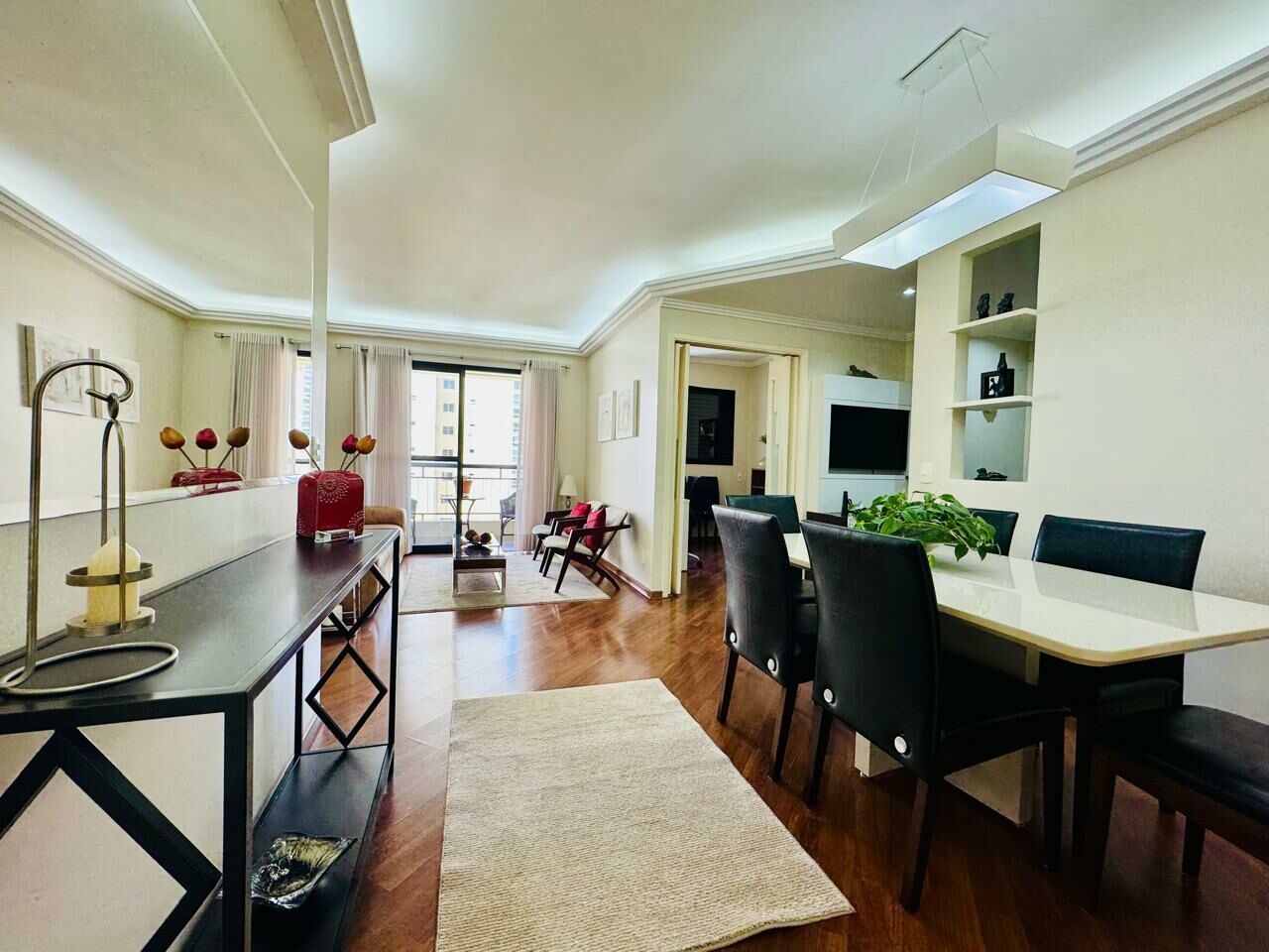 Planta Customizada: Originalmente com 4 dormitórios, foi inteligentemente atualizado para 3 dormitórios (1 suíte), privilegiando a amplitude da sala de TV.