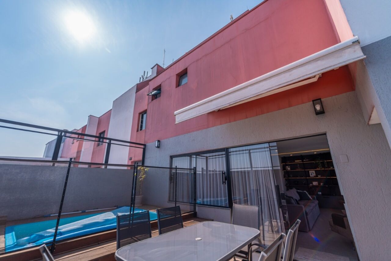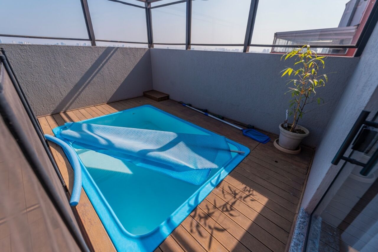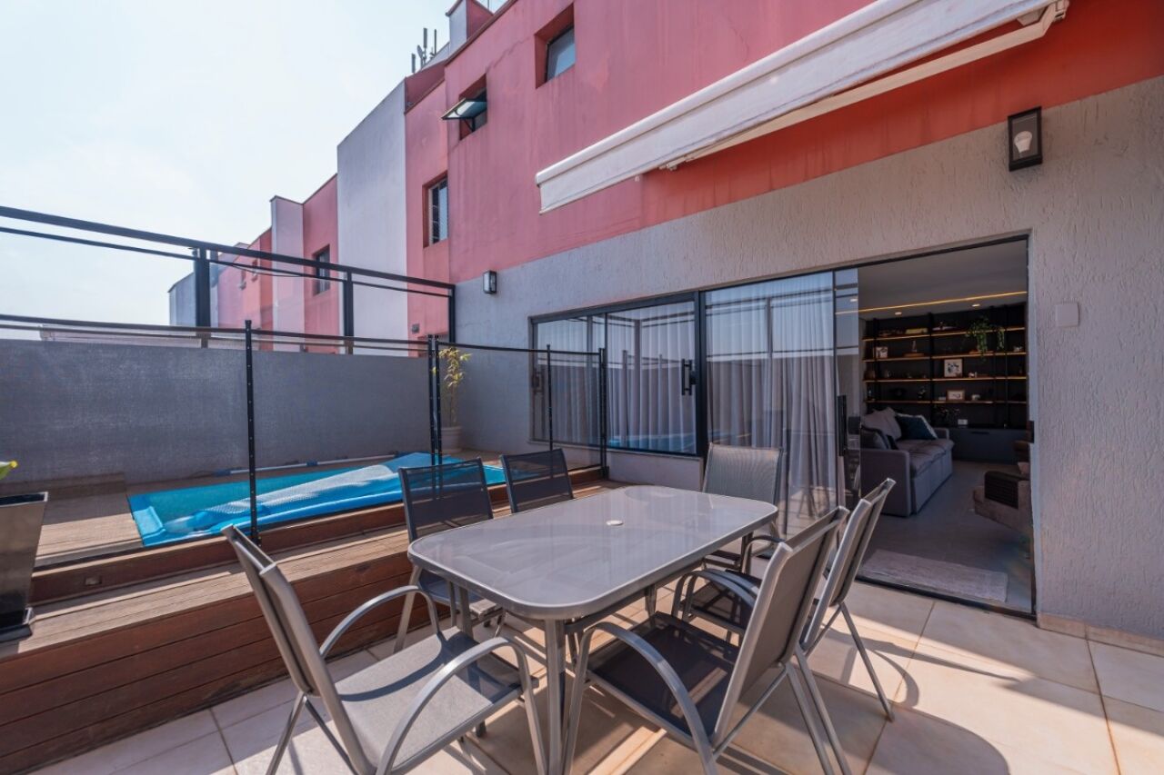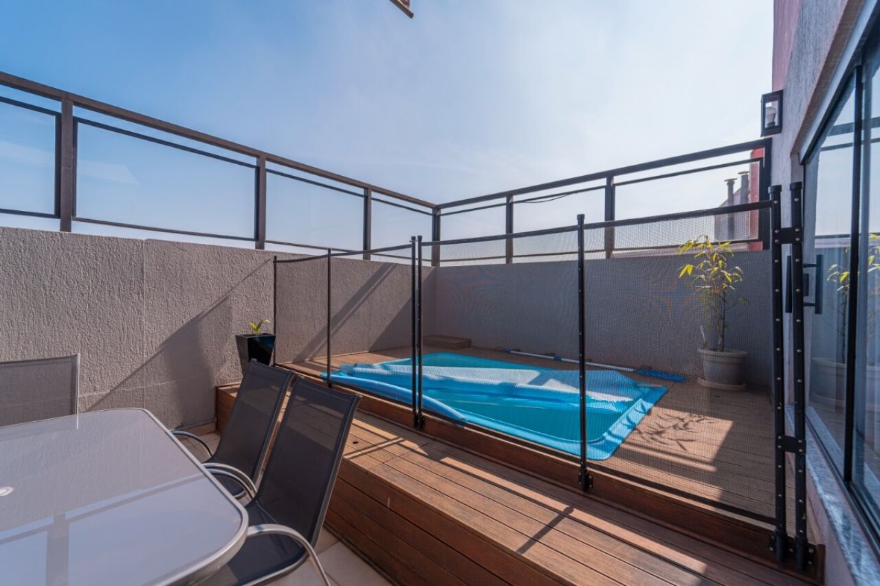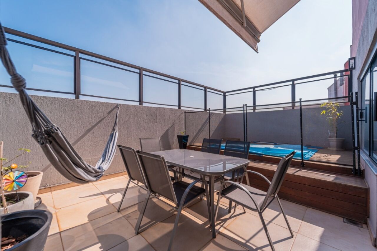 A varanda acomoda uma piscina e uma churrasqueira, perfeitas para momentos de lazer e confraternização.