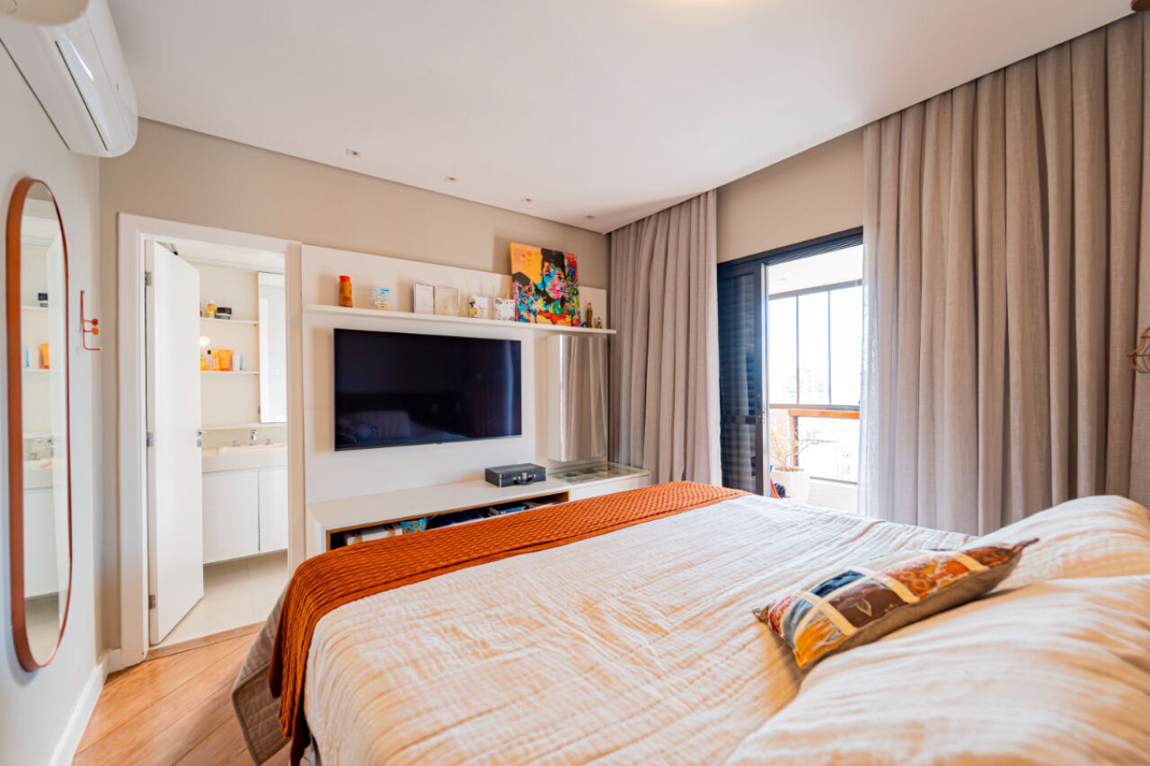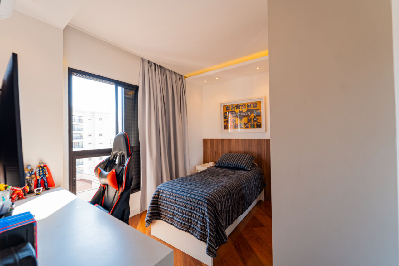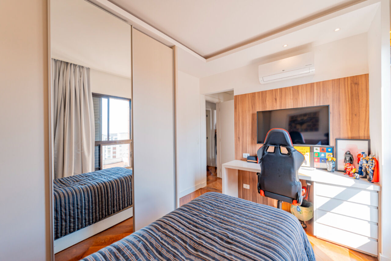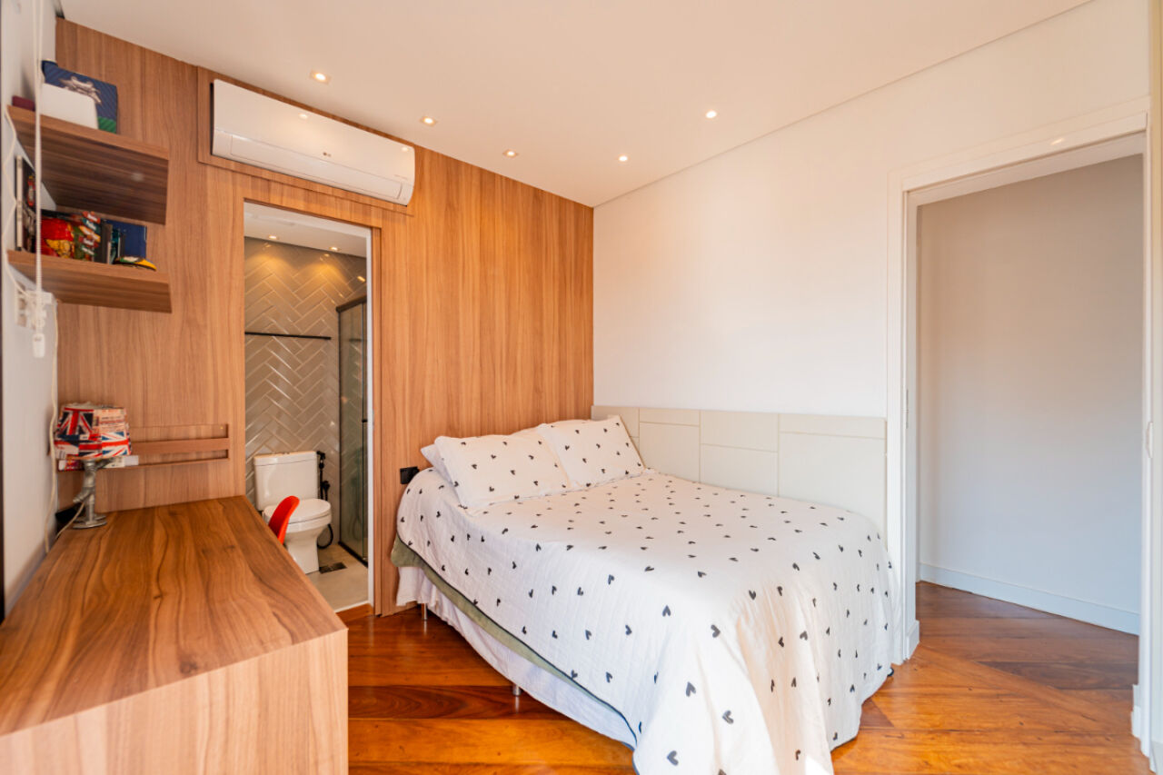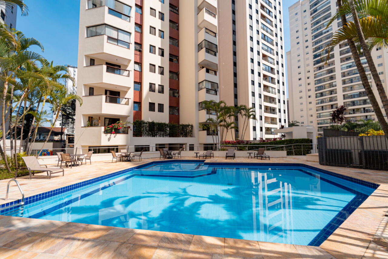 Apartamento com fino acabamento , Andar alto com excelente vista! Na melhor localização, na melhor rua do bairro. 3 vagas de garagem. Acabamento impecável. Elevador privativo com senha. Bem iluminado com janelas amplas. Planta de 3 dormitórios, 3 suítes, sendo uma master, com varanda . Armários embutidos em todos os quartos. Sala de estar com 2 ambientes com projeto de iluminação. A sala de estar tem lareira e varanda fechada com vidro. Lavabo . Sala íntima adicional projetada como sala de TV. Cozinha planejada repleta de armários. Total de 5 banheiros. Área de serviço espaçosa com armários. Dependência de empregada com banheiro. Lazer com piscina climatizada, salão de festas, academia, playground, sala de jogos, churrasqueira e brinquedoteca. Prédio com gerador. Aquecimento a gás.