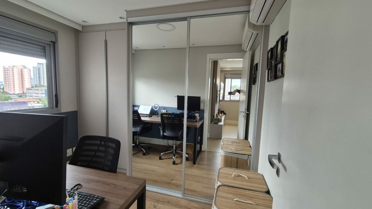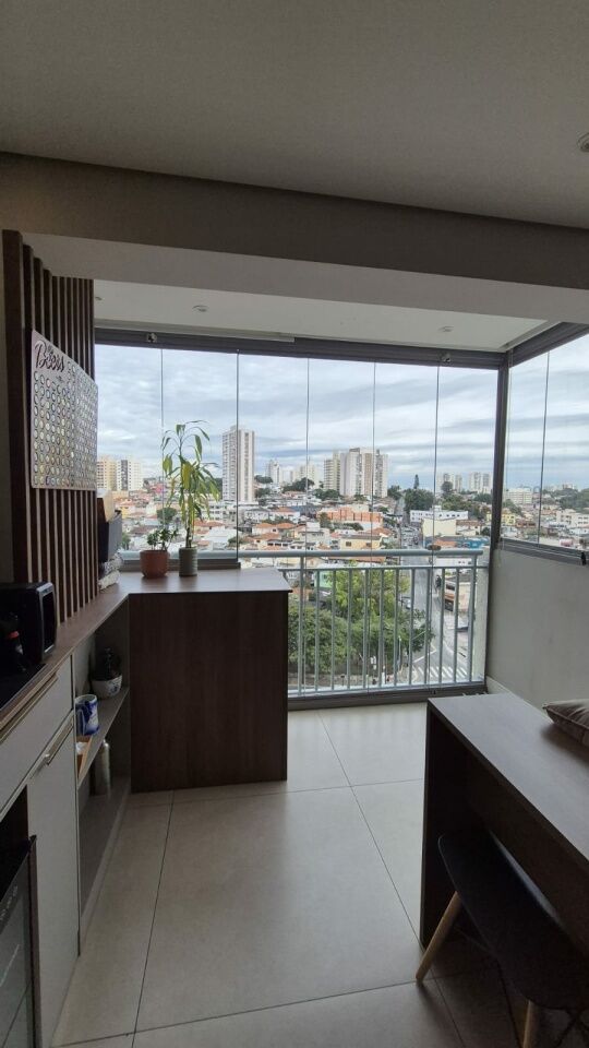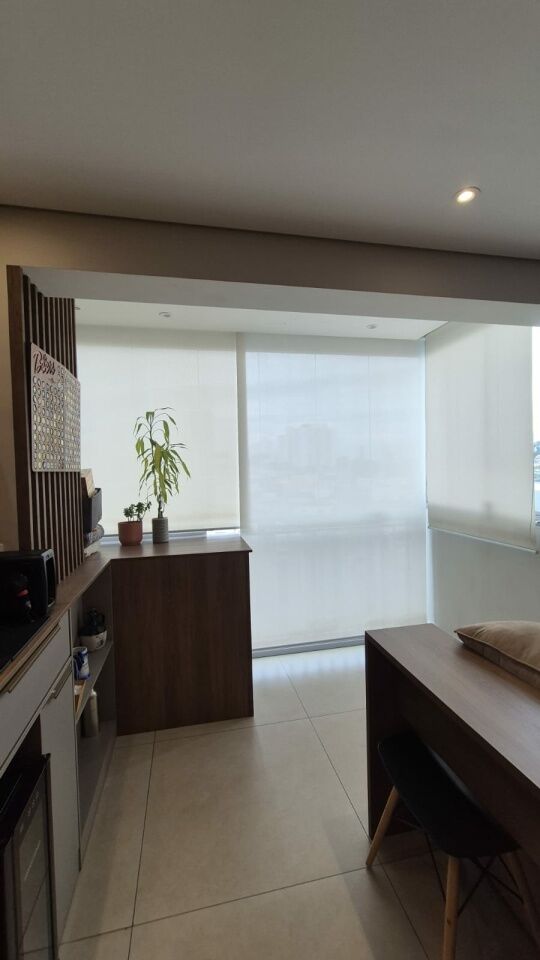 Em comunicação com a sala, a vista do andar alto e livre é um diferencial. Com vidros e cortinas, possui espaço para home office/escritório, móveis em madeira e persianas instaladas.