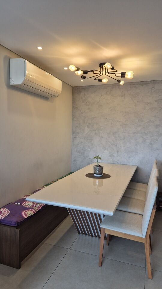 A primeira visão ao entrarmos é de um ambiente acolhedor, confortável, claro, arejado e bem distribuído. O cantinho estilo alemão é um diferencial de conforto e organização, parede diferenciada, mesa ampla, ar condicionado completando este primeiro ambiente.