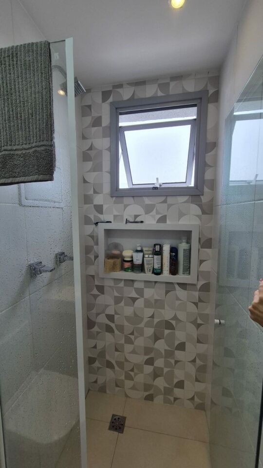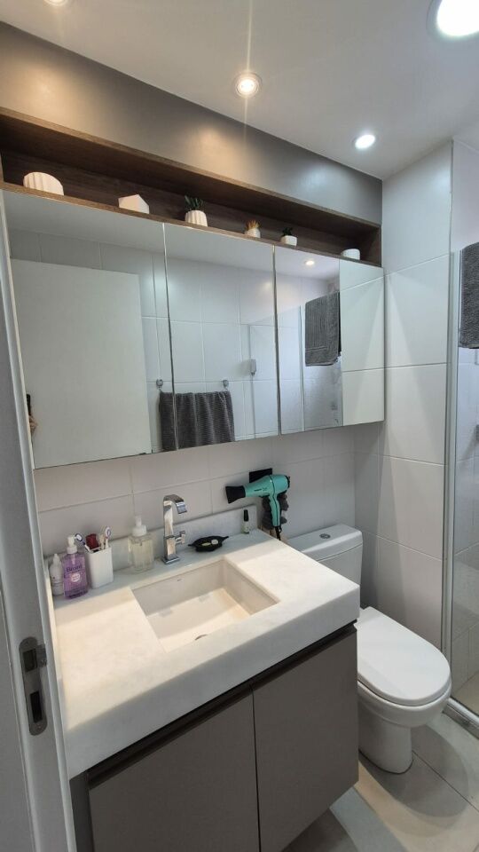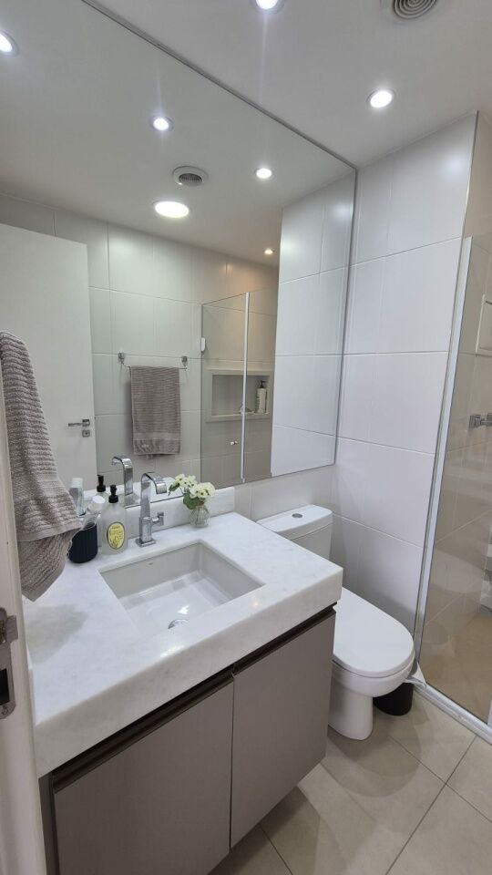 Espaçoso, com gabinete e pia em mármore. Espelho amplo, box de vidro com nicho interno de organização.