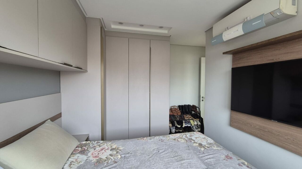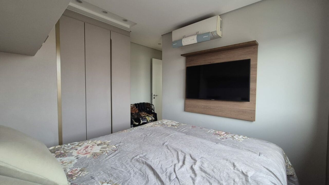 Possui espaço para mesinhas de cabeceira, armário aéreo de quatro postas, espaço destinado à TV além de um armário de quatro portas piso-teto.