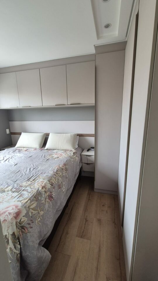 Possui um armário planejado de duas portas com espelho e duas em madeira. Janela alumínio com cortina interna e esteira externa blackout.