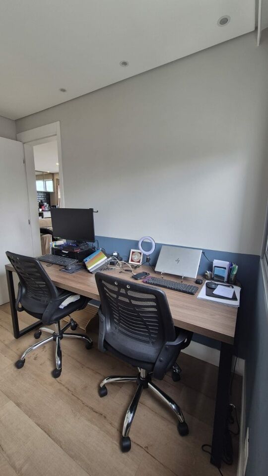 Projeto de iluminação presente. Hoje o cômodo possui uma ampla bancada com função home office e duas cadeiras. Piso laminado no dormitório.