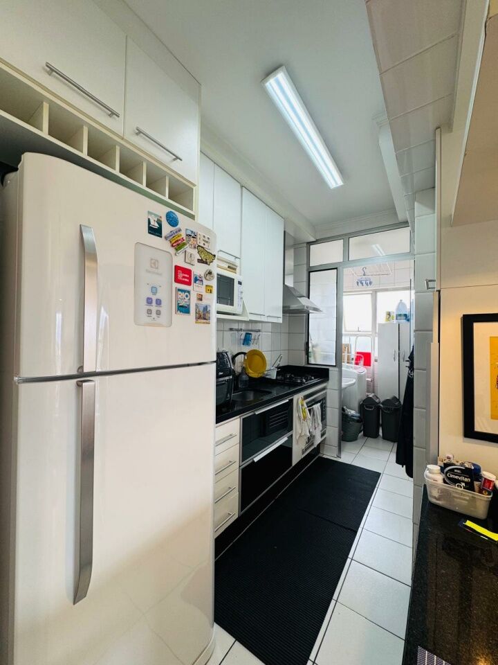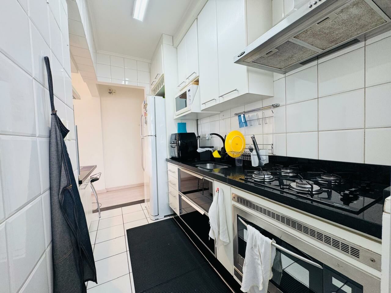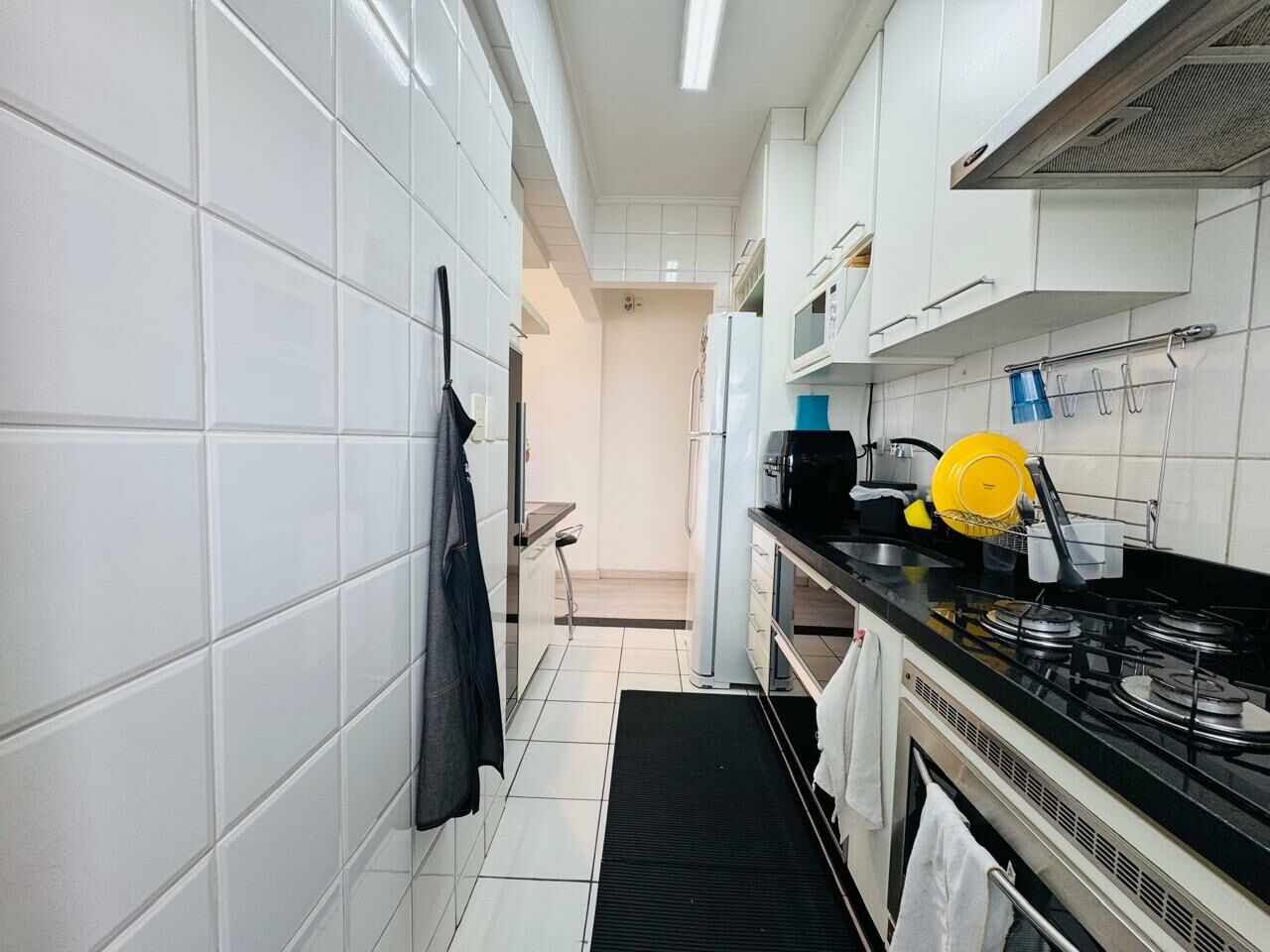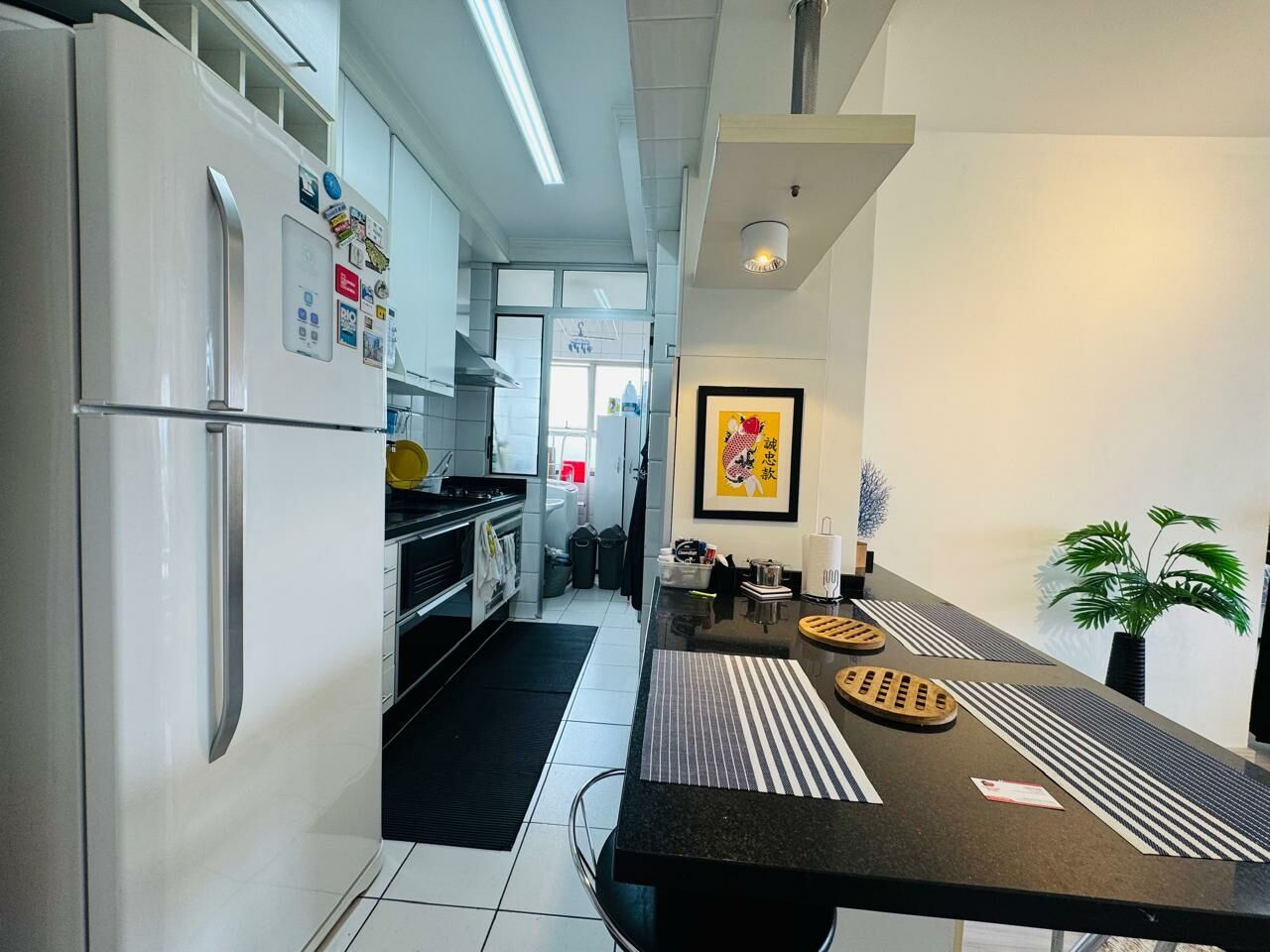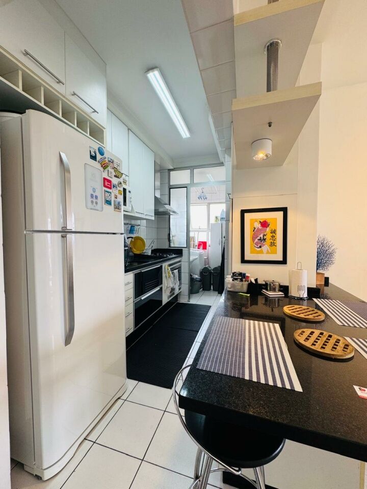 Cozinha funcional tipo americana, também equipada com armários planejados.