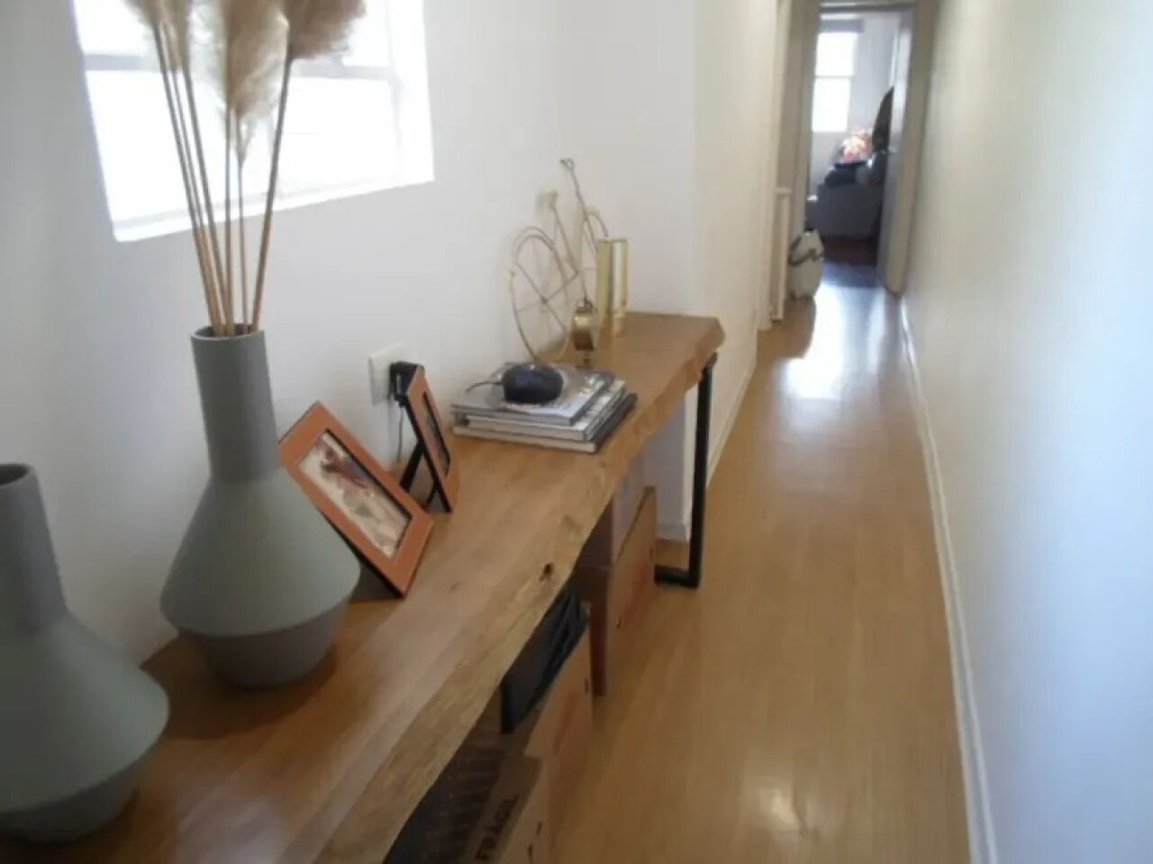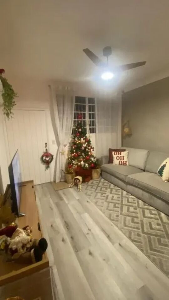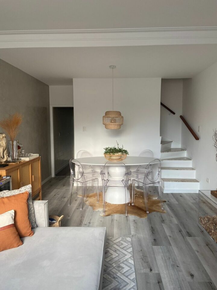 No piso inferior, começamos por uma sala ampla, clara e ventilada em piso laminado, com espaço para dois confortáveis ambientes, estar e jantar.