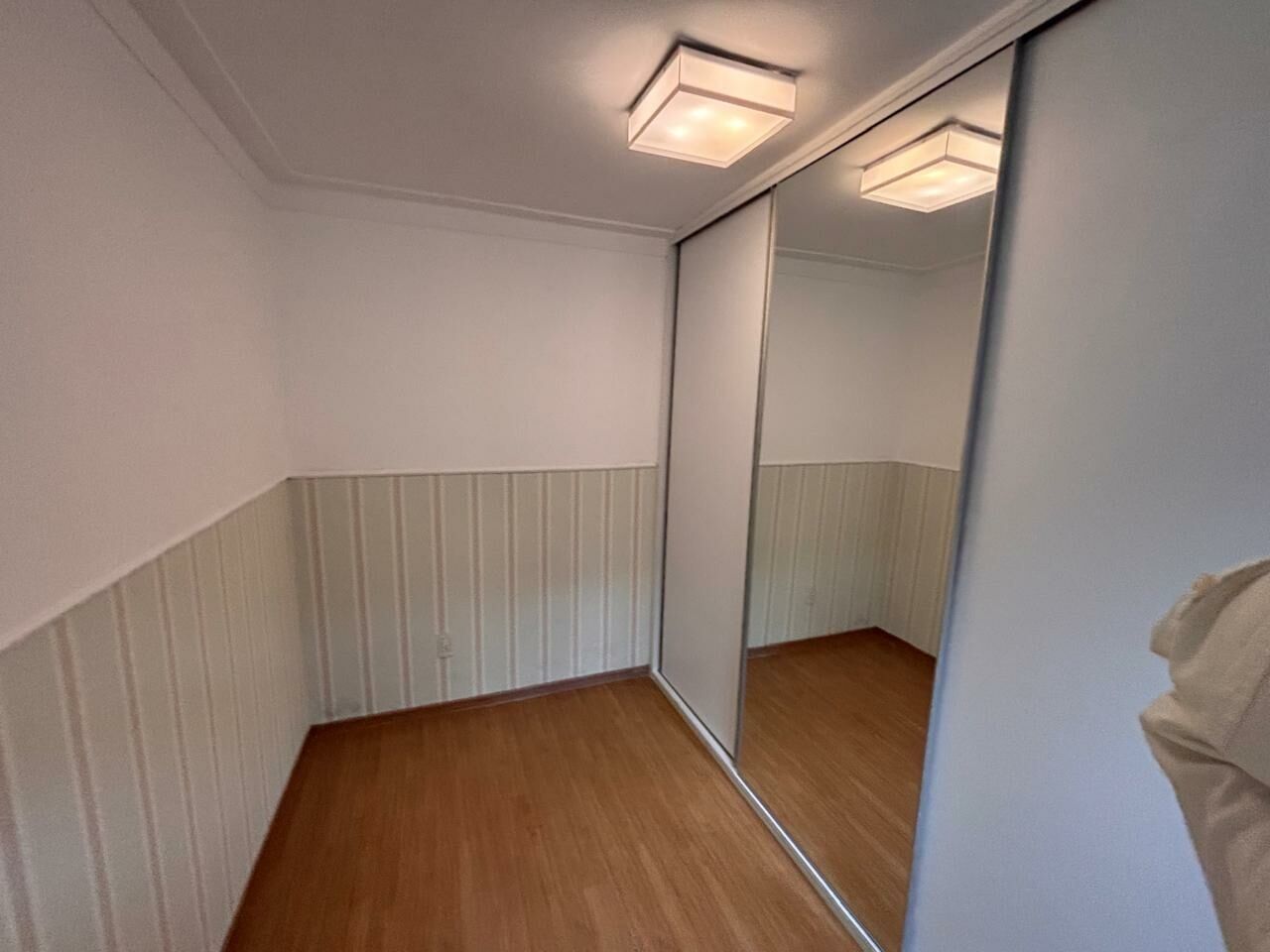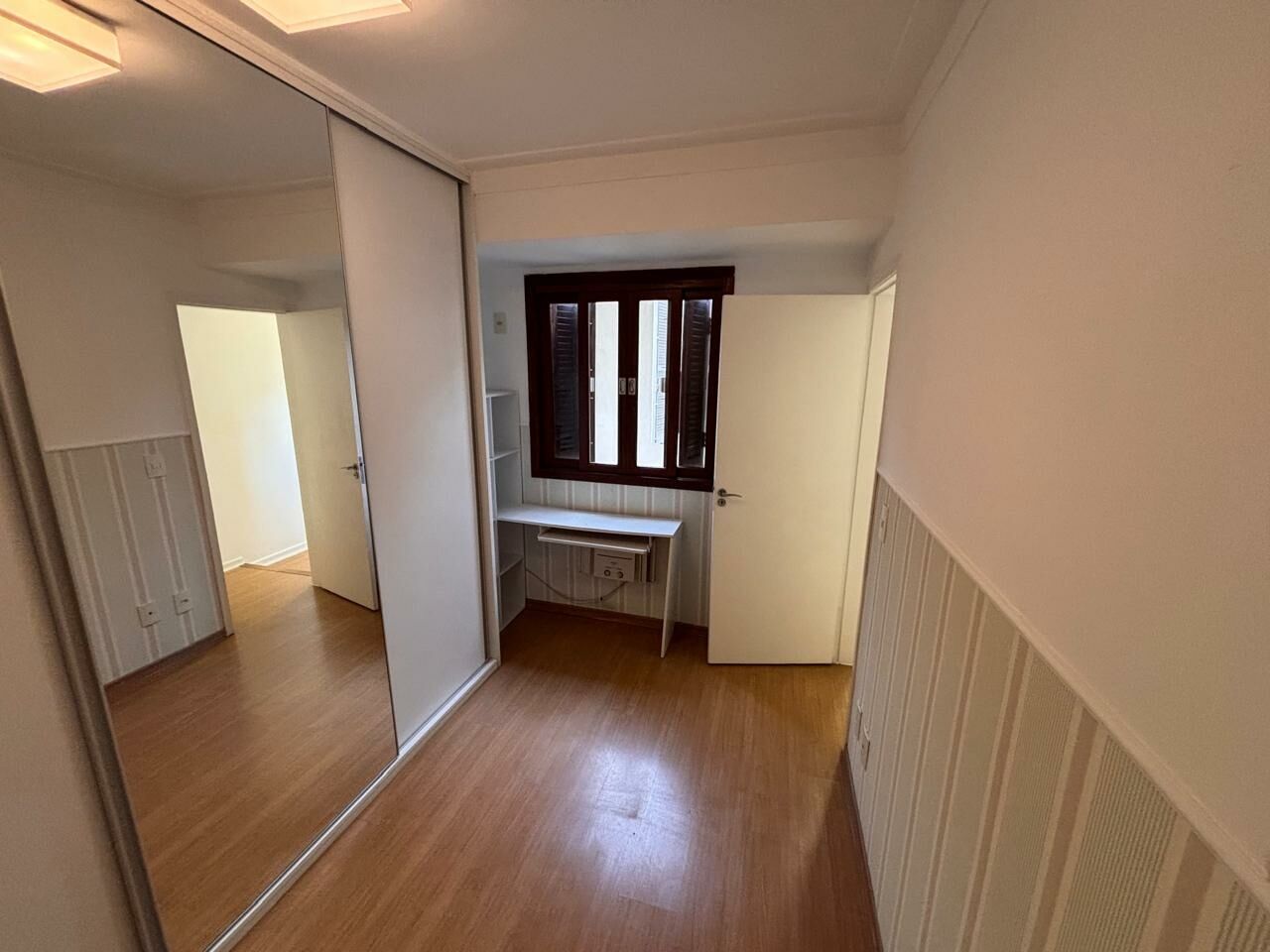 Corredor com acesso aos demais 2 quartos, todos com ar condicionado e piso em madeira, repleto de armários planejados e de alta qualidade. Pé direito alto.