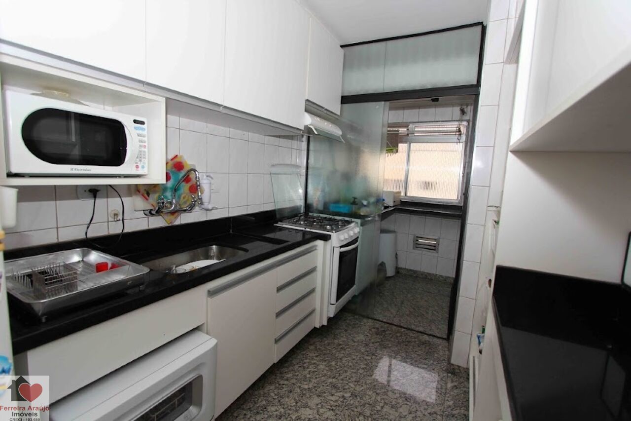 Cozinha repleta de armários e bancada, iluminação natural, fogão embutido e espaço para micro-ondas no planejado. E área para refeição.