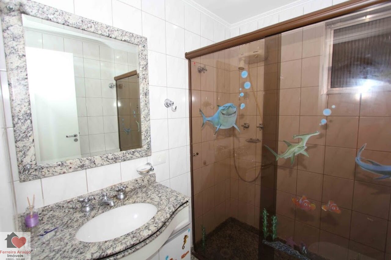 2 Suítes com armário planejado, sendo uma no piso inferior e outra no piso superior, banheiros com box de vidro, espelhos e gabinete.