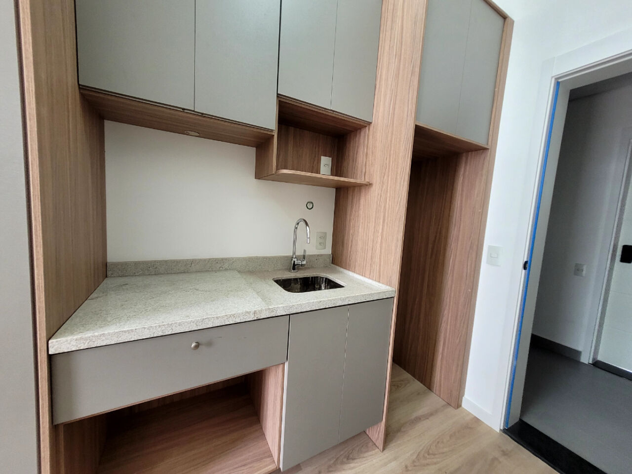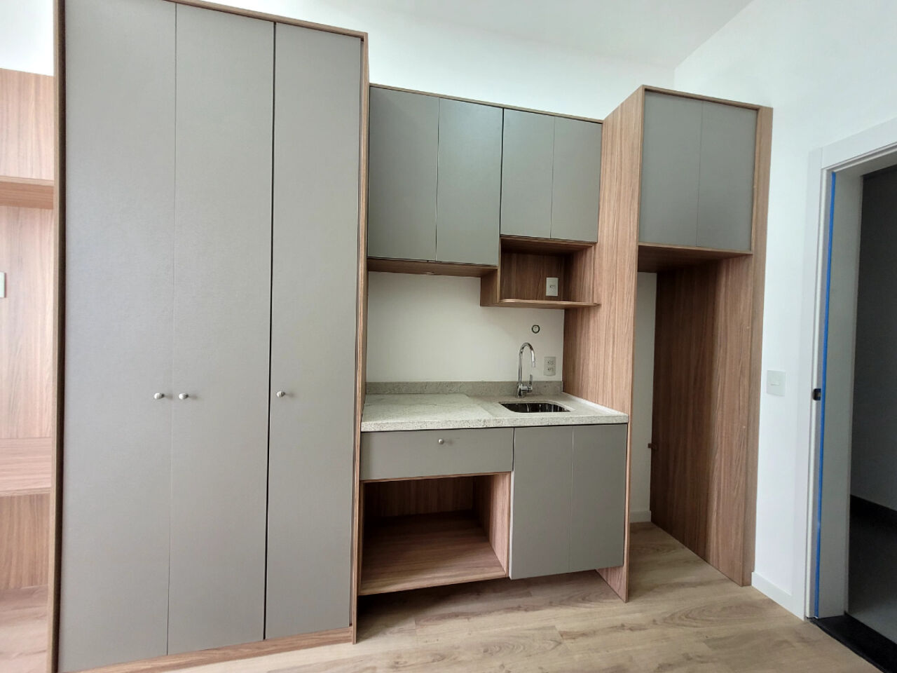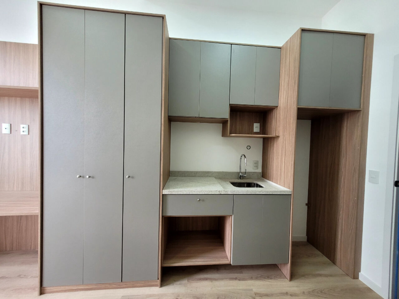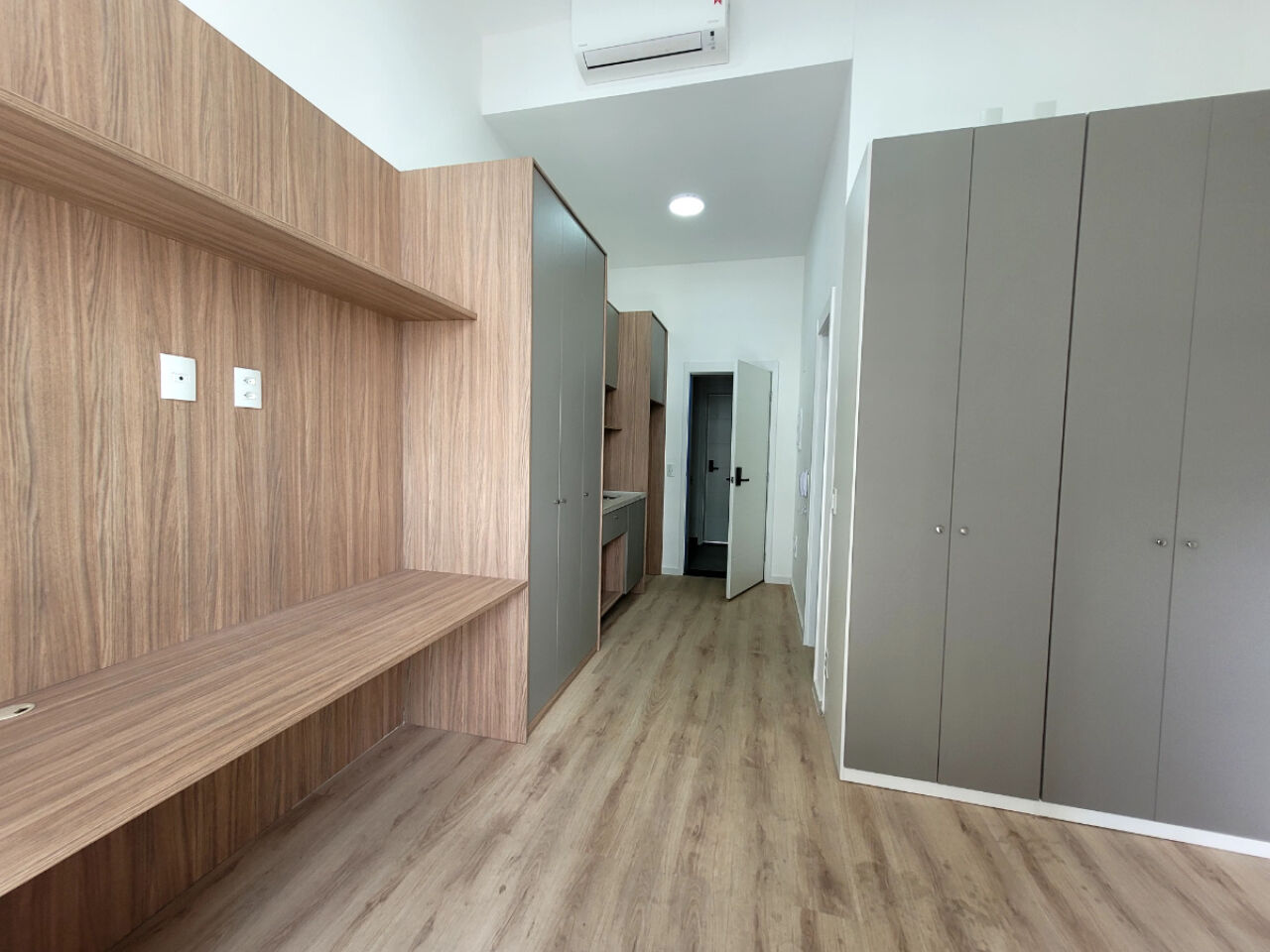 O studio é mobiliado e possui móveis planejados que otimizam o espaço de forma inteligente, além de uma cozinha integrada que proporciona funcionalidade. O ambiente é climatizado com ar-condicionado central e oferece vista para a cidade, garantindo um toque especial ao dia a dia, possuindo ainda interforne e aquecimento.