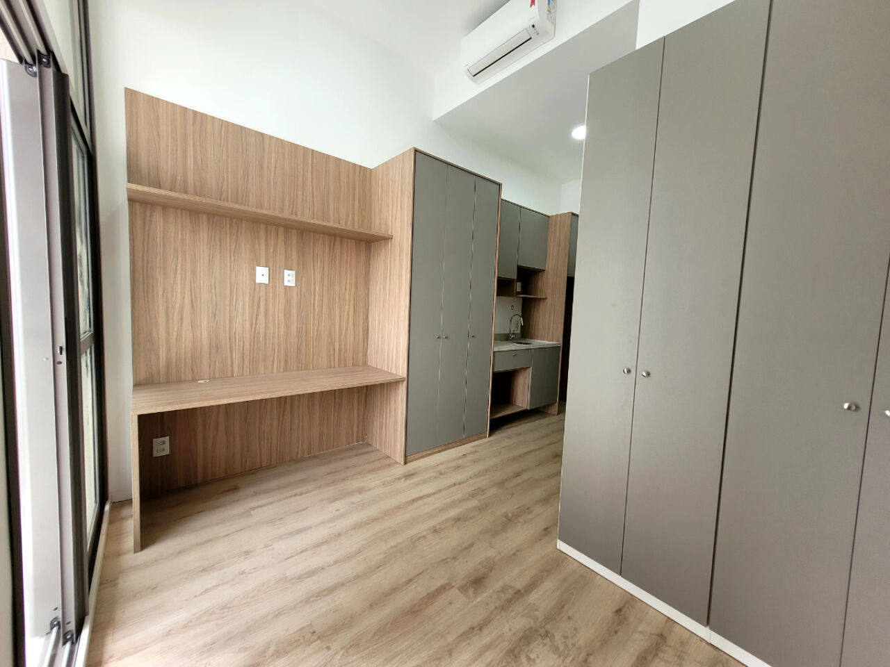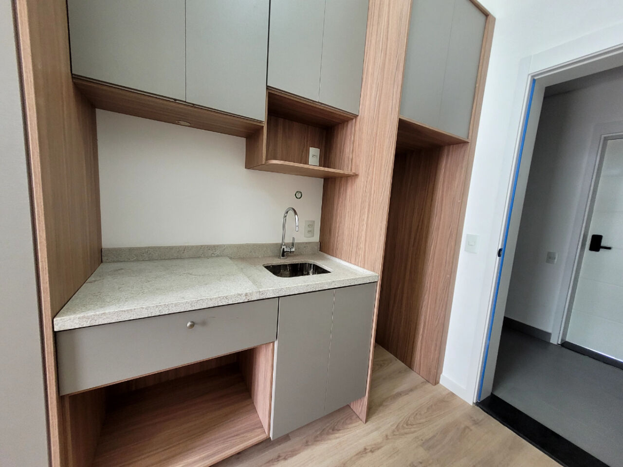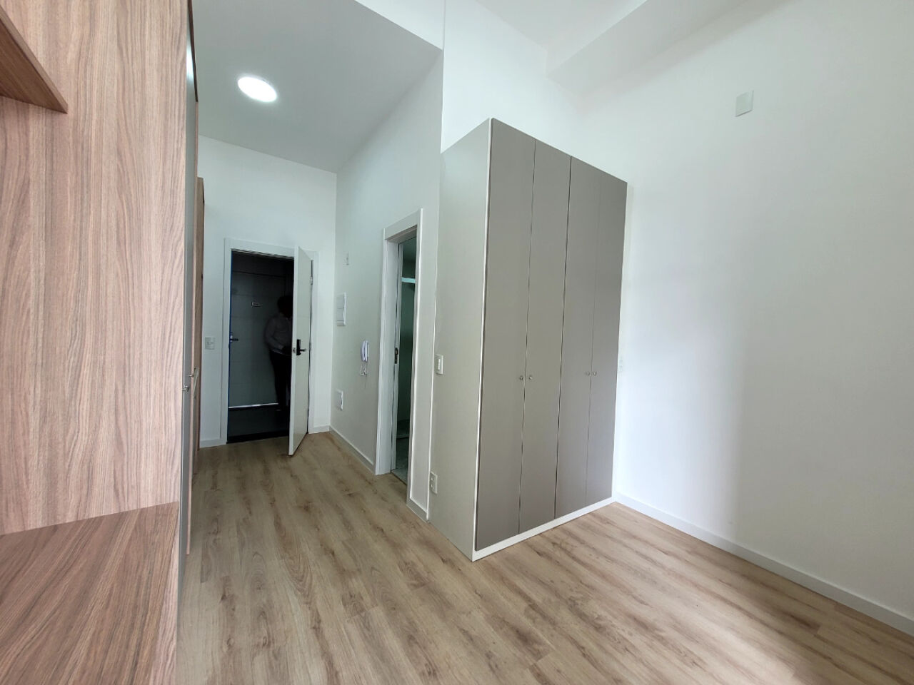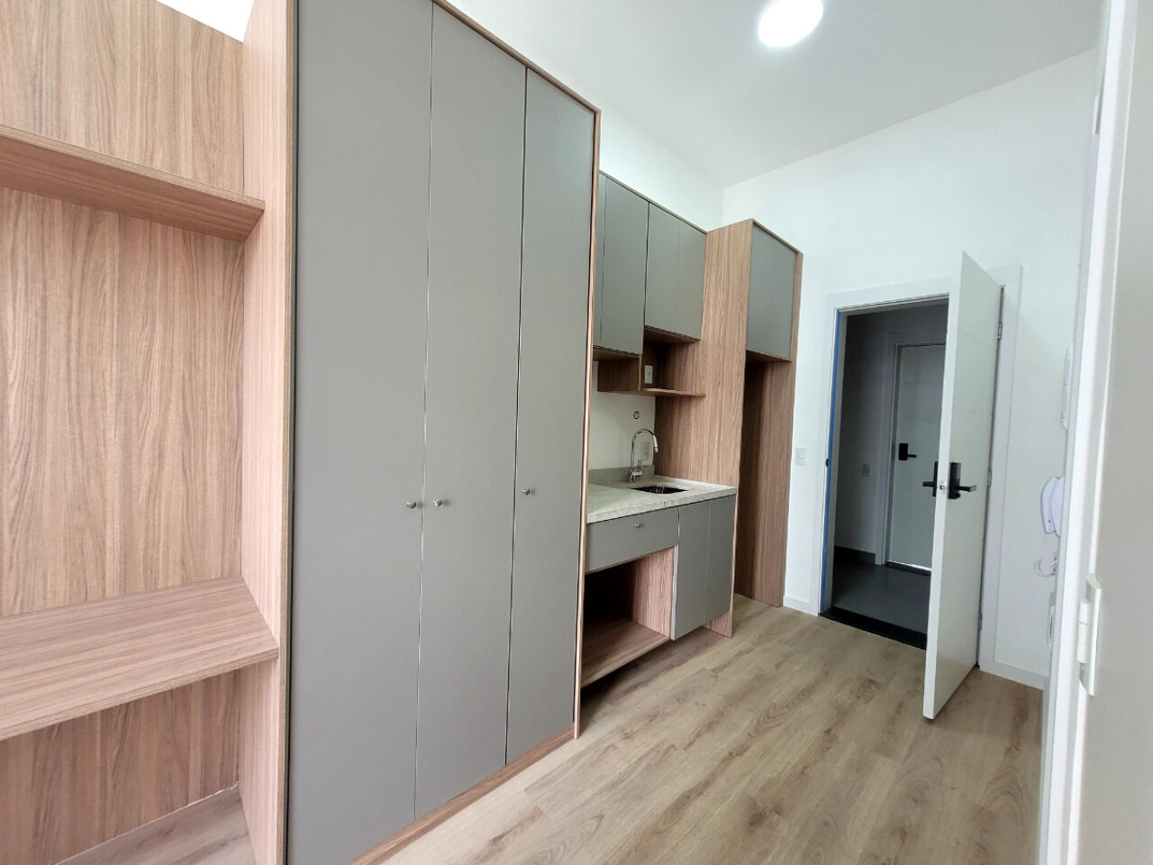 O studio é mobiliado e possui móveis planejados que otimizam o espaço de forma inteligente, além de uma cozinha integrada que proporciona funcionalidade. O ambiente é climatizado com ar-condicionado central e oferece vista para a cidade, garantindo um toque especial ao dia a dia, possuindo ainda interforne e aquecimento.