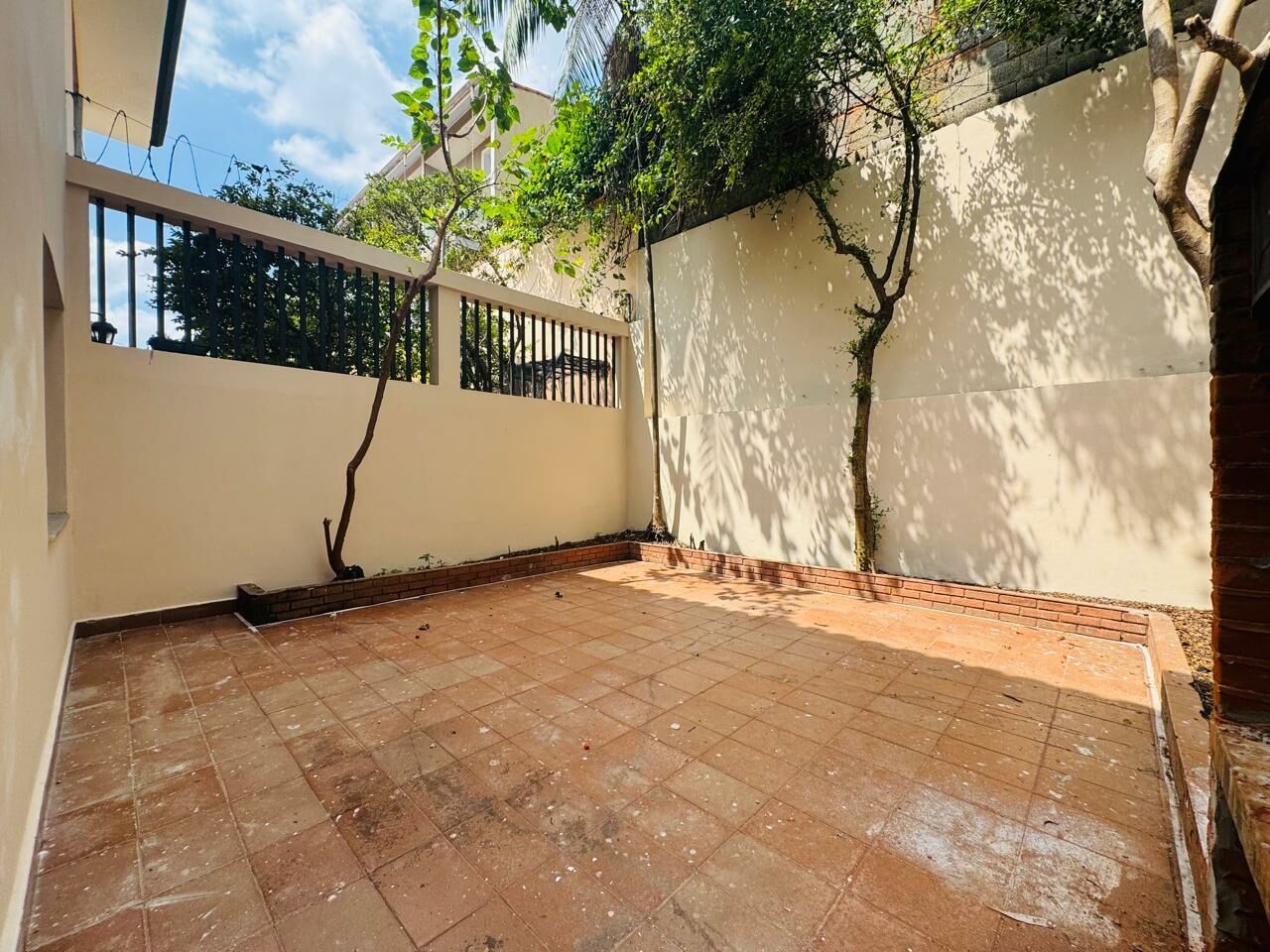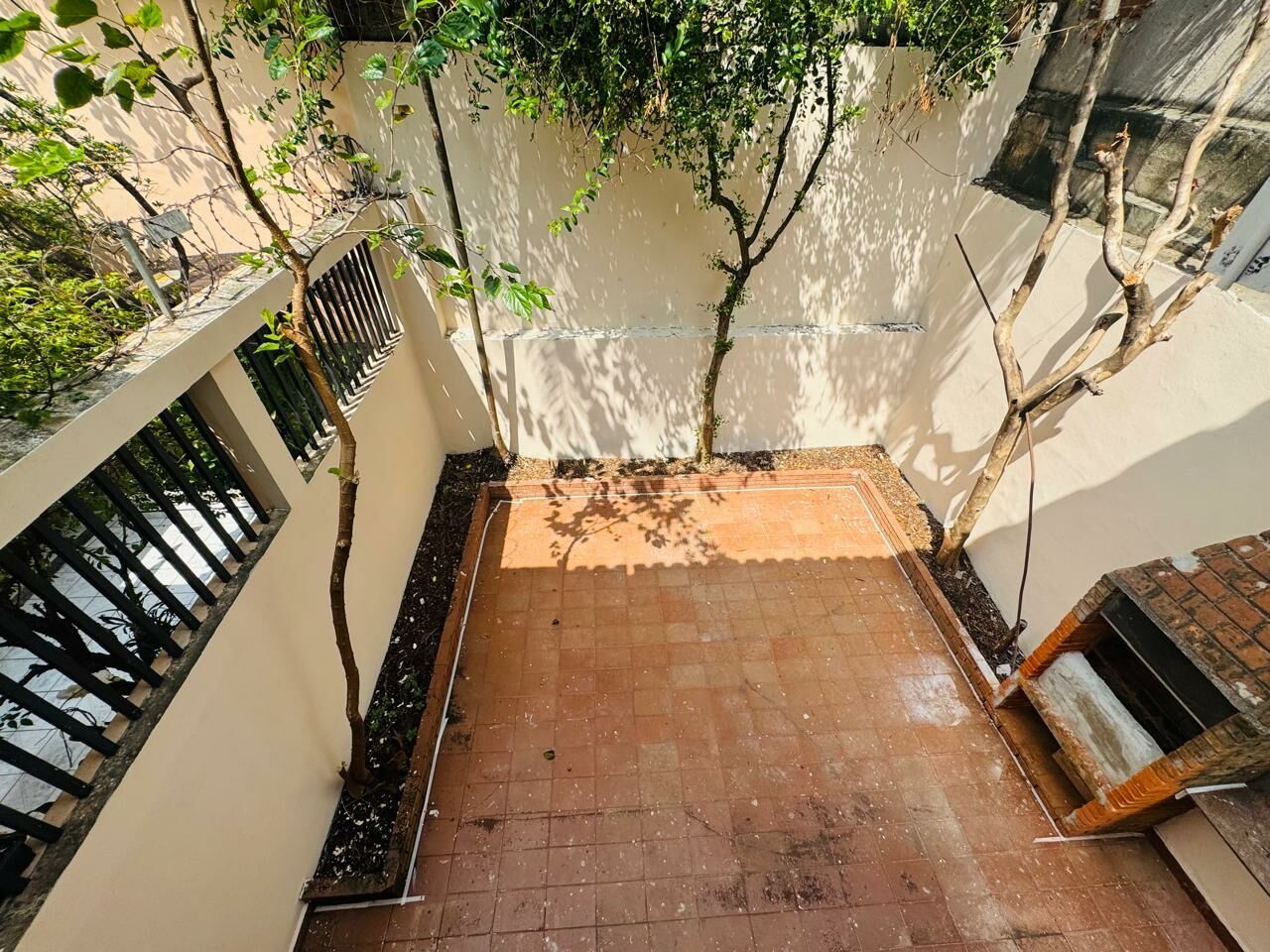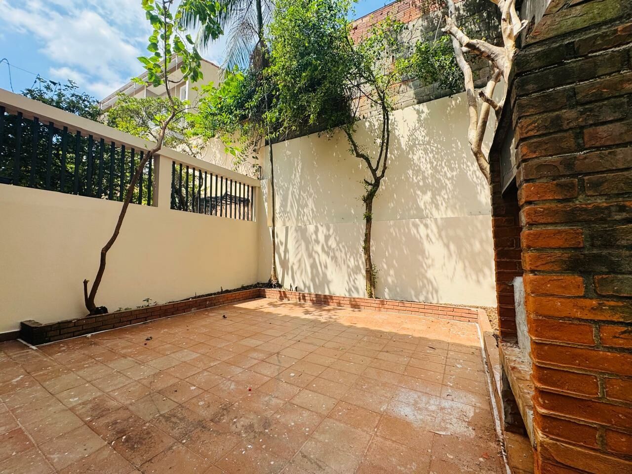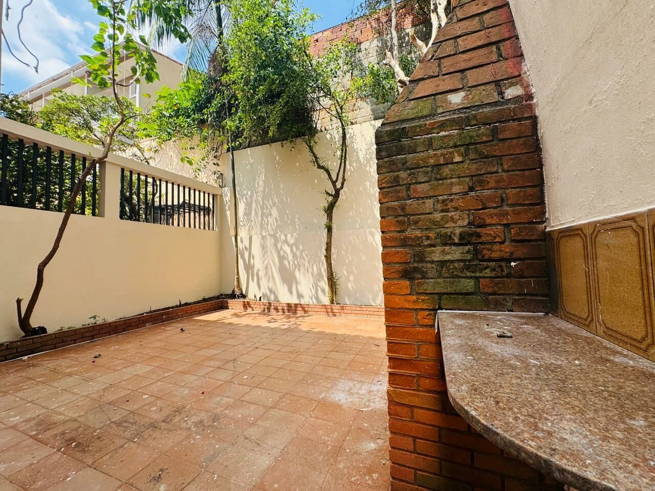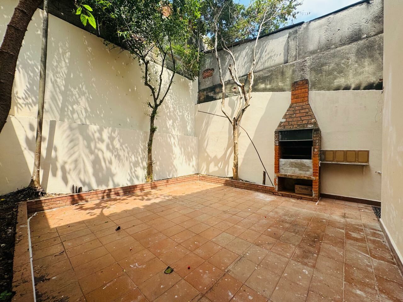 Quintal com churrasqueira e corredor lateral, proporcionando espaço para relaxar e aproveitar o ar livre.