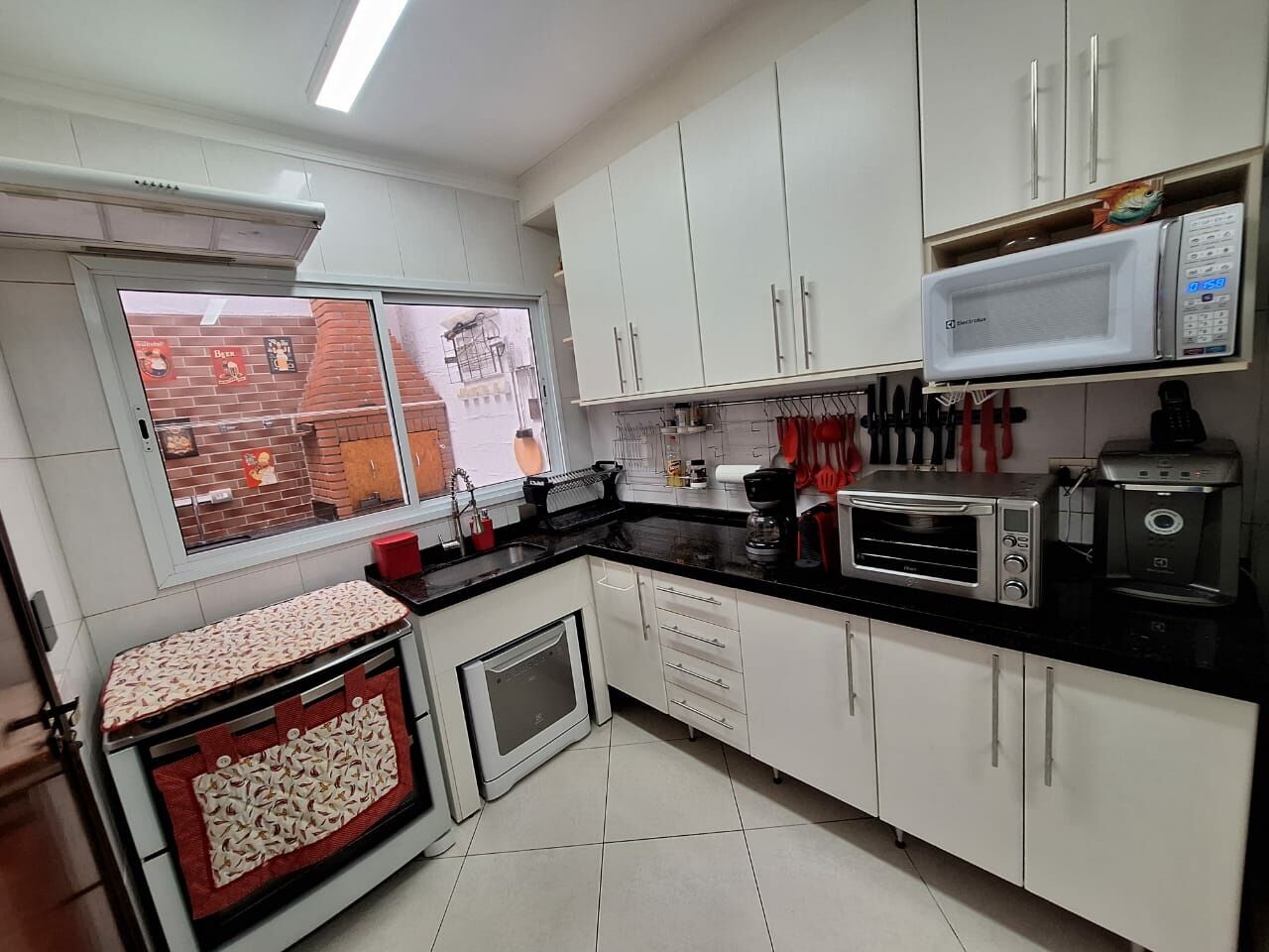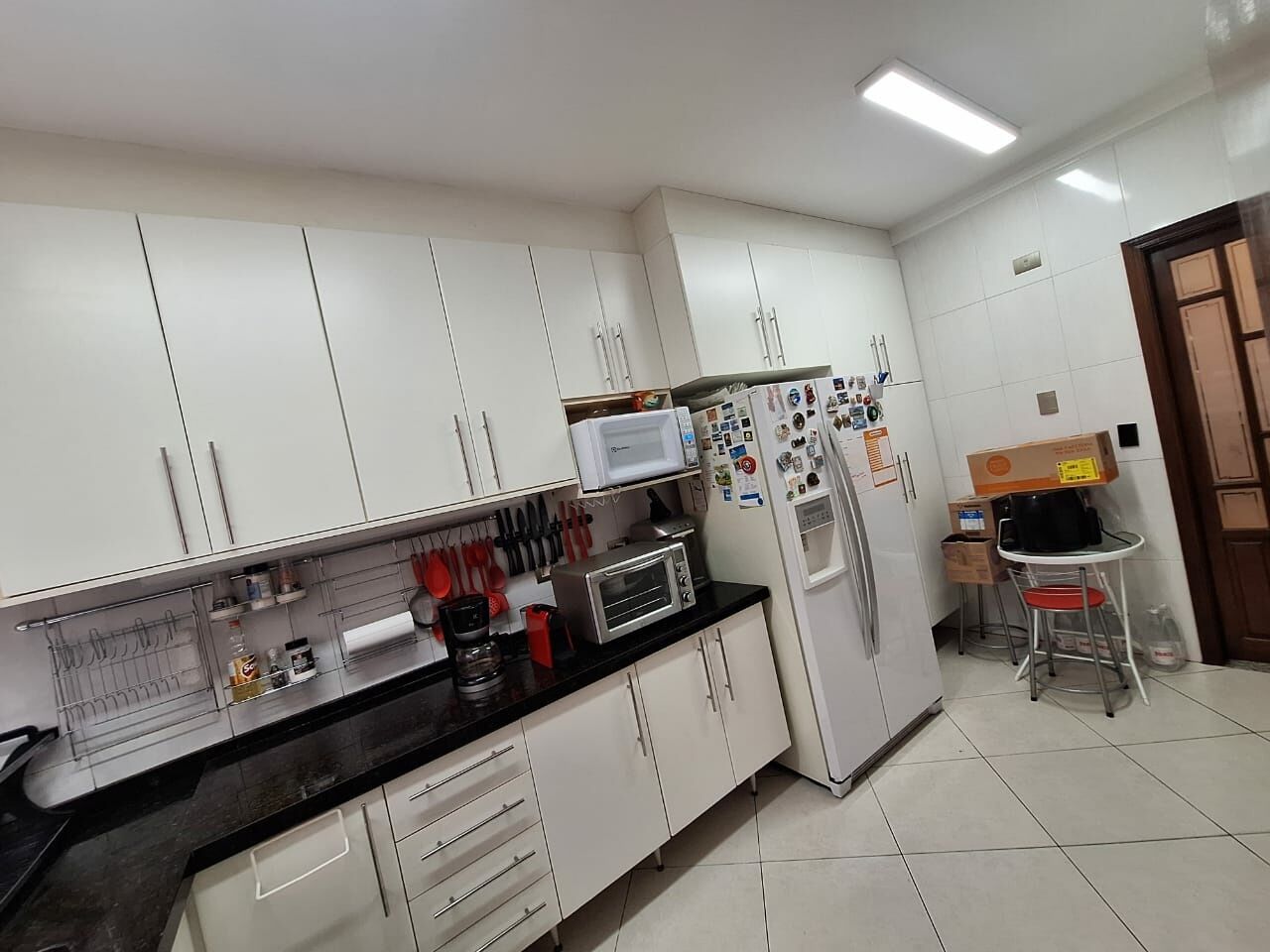 Cozinha planejada, integrada e repleta de armários, ideal para quem ama cozinhar.